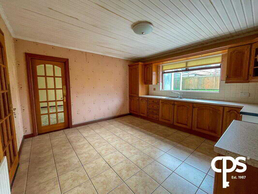 The dining area presents ample space for a family sized table with multiple chairs, area and also allows for access to the rear of the property though double patio doors.