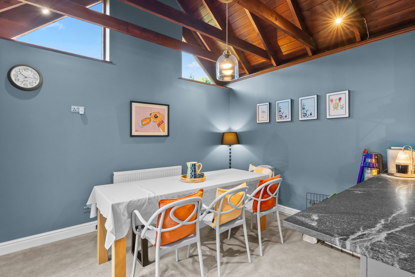 - Stylish open-plan kitchen/dining room with vaulted ceiling and exposed beams