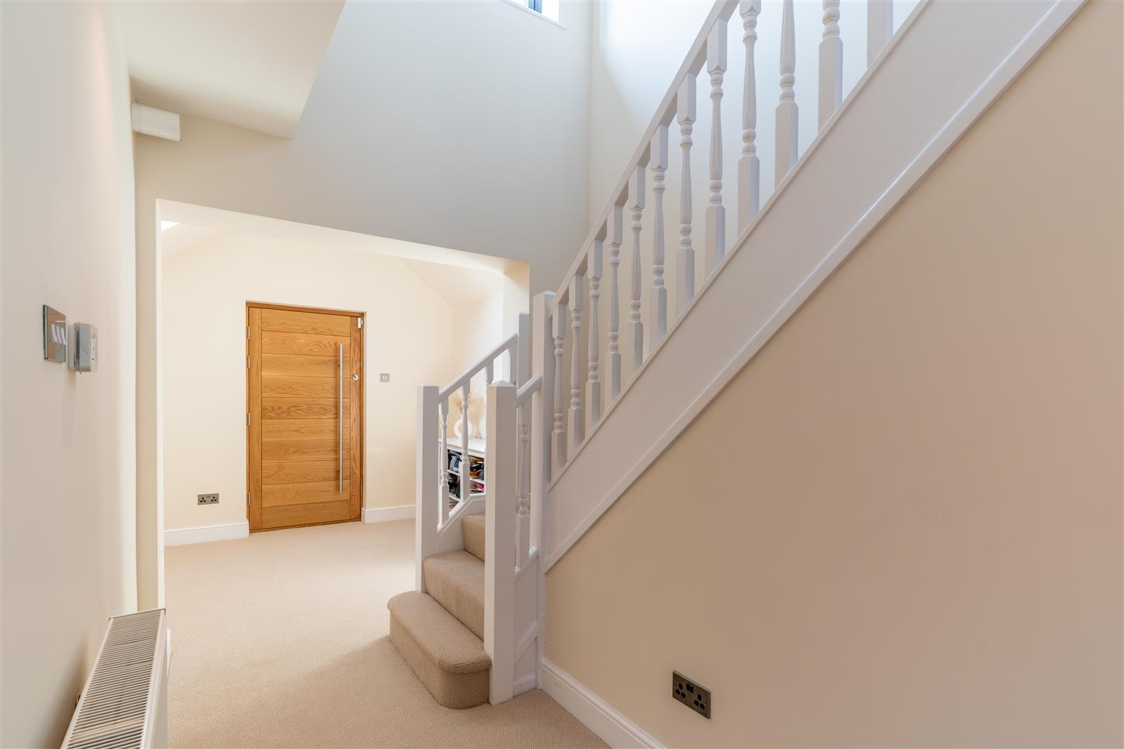 Entrance Hall - Part vaulted ceiling with Velux window, inset spotlights, power points, radiator, stairs rising to the first floor landing, doors to.