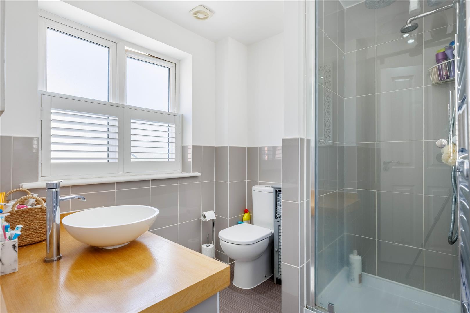 En-Suite - Double glazed UPVC frosted window with internal timber shutters to front aspect, three-piece suite, low level WC, oval wash hand basin with mixer tap, tile enclosed shower with glass door and rainfall head, wall mounted heated towel rail, partially tiled walls, vinyl flooring, inset spotlights, extractor fan.