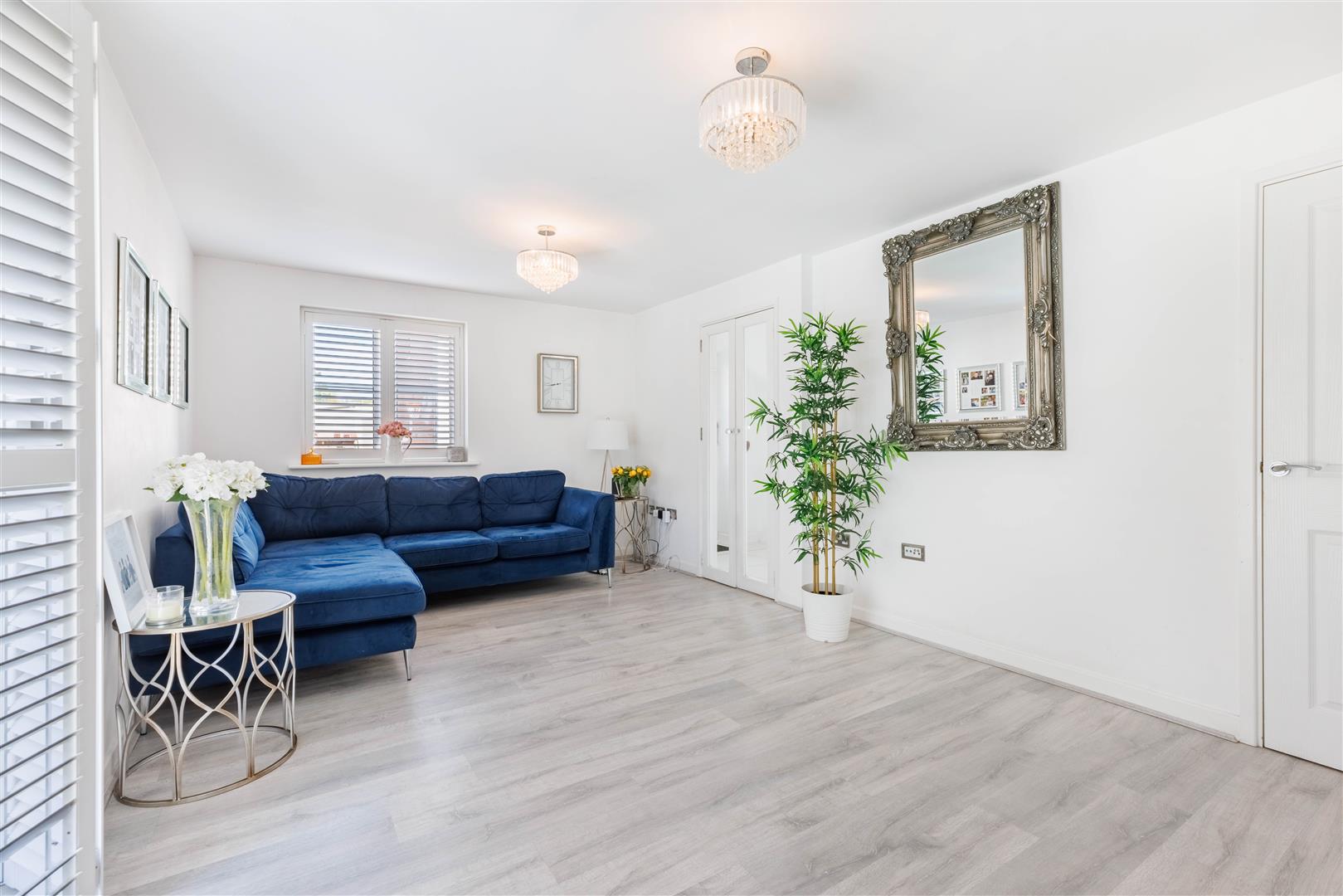 Living Room - 5.4m x 3.4m (17'8" x 11'1") - Double glazed UPVC window with internal timber shutter to front aspect, double glazed UPVC French doors with internal timber shutters to the side aspect, access to storage cupboard, wall mounted radiator, laminate flooring, ceiling mounted light fixture, TV point, various power points.