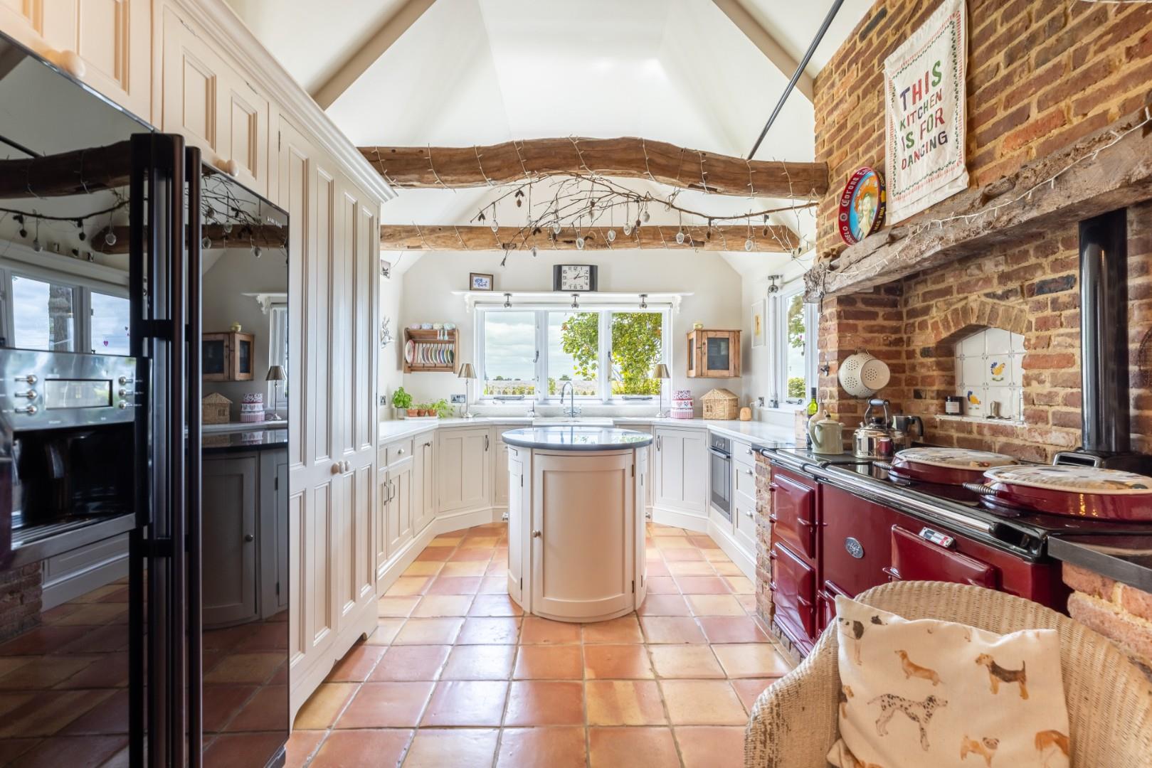 Kitchen/Breakfast Room - 6.7m x 6.4m (21'11" x 20'11") - Fitted with a range of base level units with Corian working surfaces over, inset butler sink, AGA with extractor over, additional single oven. Space for fridge/freezer, integrated dishwasher. Exposed timbers and brick work, tiled flooring, windows to multiple aspects, ceiling light points, inset down lighters, television point, various power outlets, French doors to garden. Door leading to:-