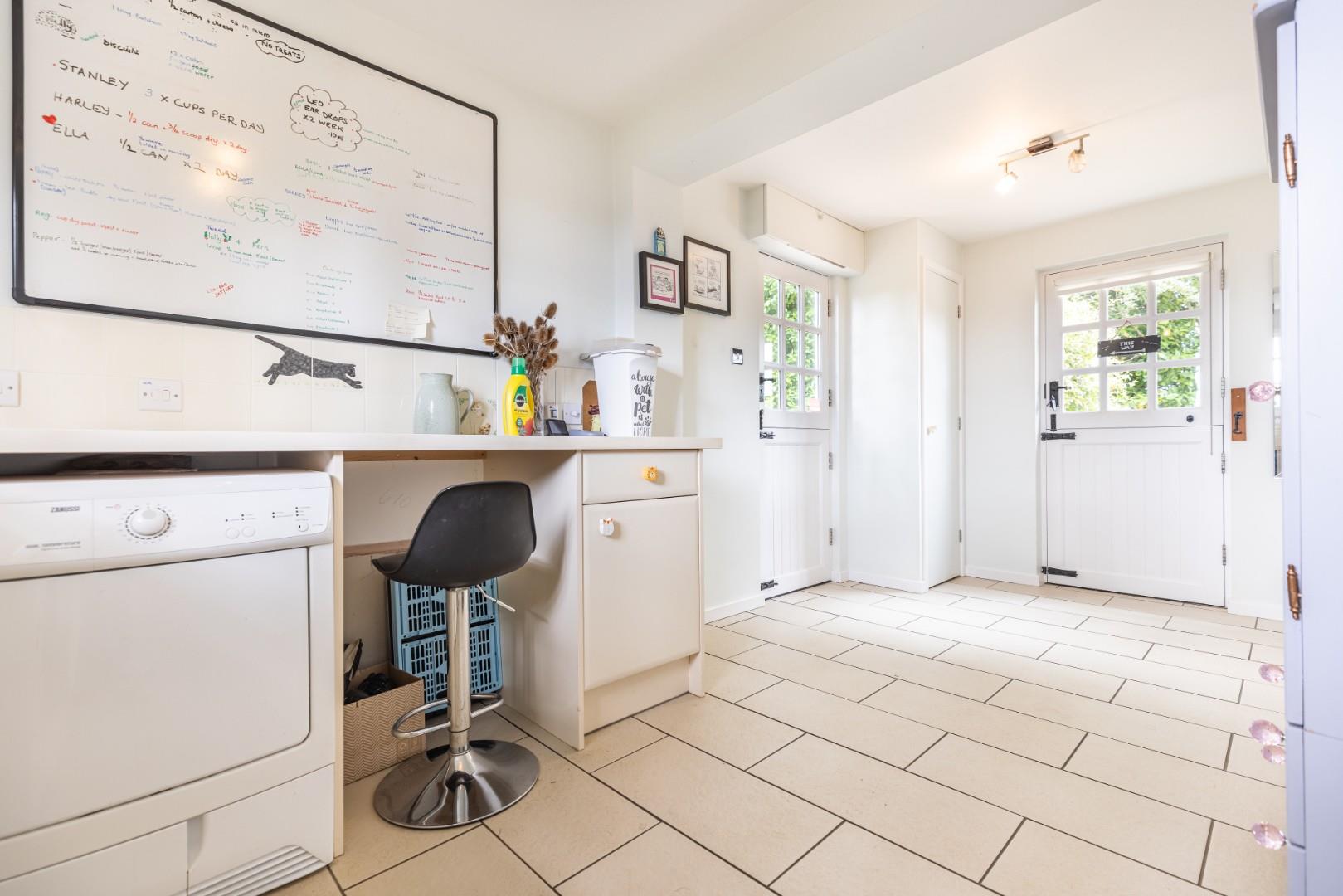 Utility Room - Butler sink unit set in solid wood drainer and worktop with cupboard under, water softener, laundry cupboard, plumbing for washing machine. Tiled flooring, stable door and window to garden.