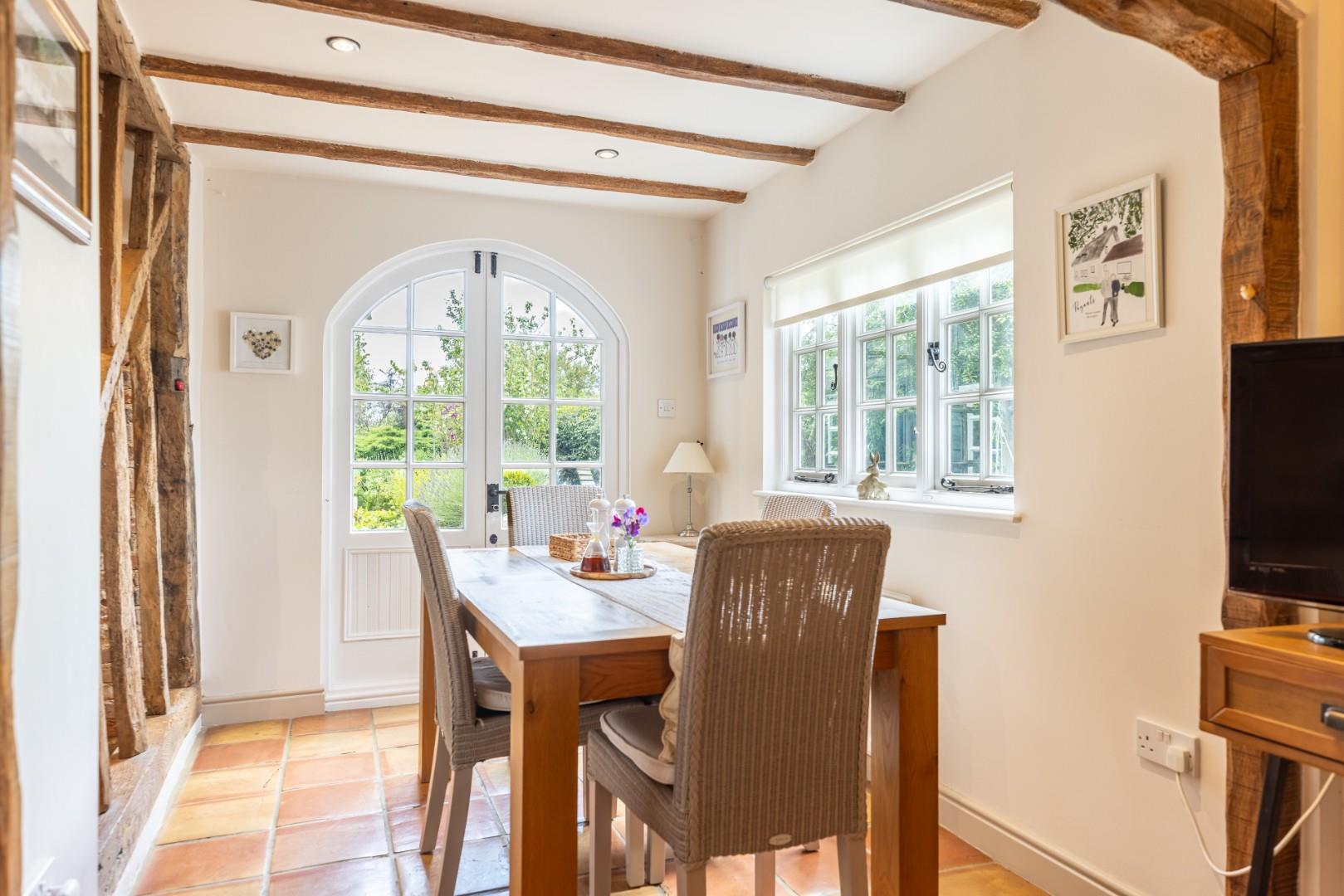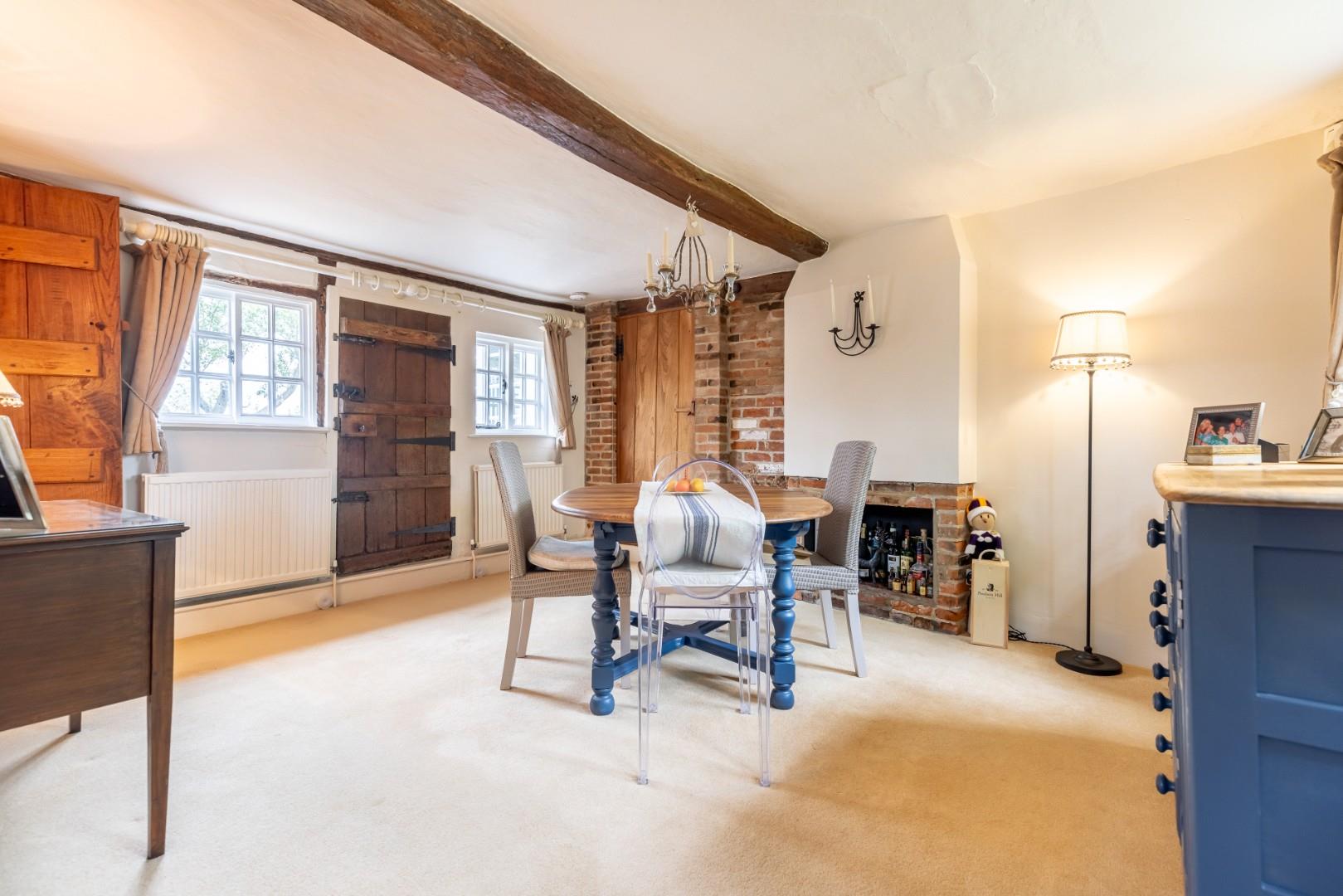 Dining Room - 4.3m x 3.7m (14'1" x 12'1") - Exposed brick work and timbers, feature red brick open fireplace, windows to dual aspects, carpeted flooring, two radiators, solid oak door to rear garden, Concealed stairs rising to master and bedroom two. Opening to:-