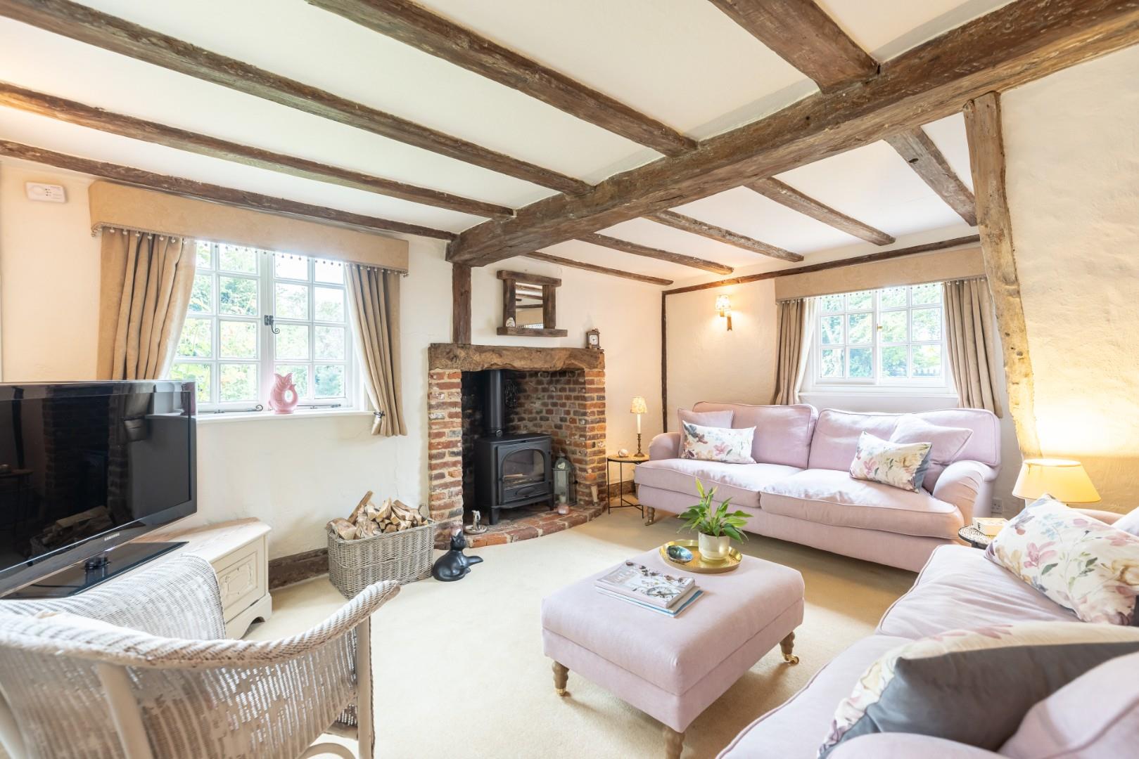 Living Room - 4.2m x 3.7m (13'9" x 12'1") - Windows to multiple aspects, exposed timbers, feature red brick fireplace fitted with a wood burning stove, carpeted flooring, wall light points, television point, various power outlets.