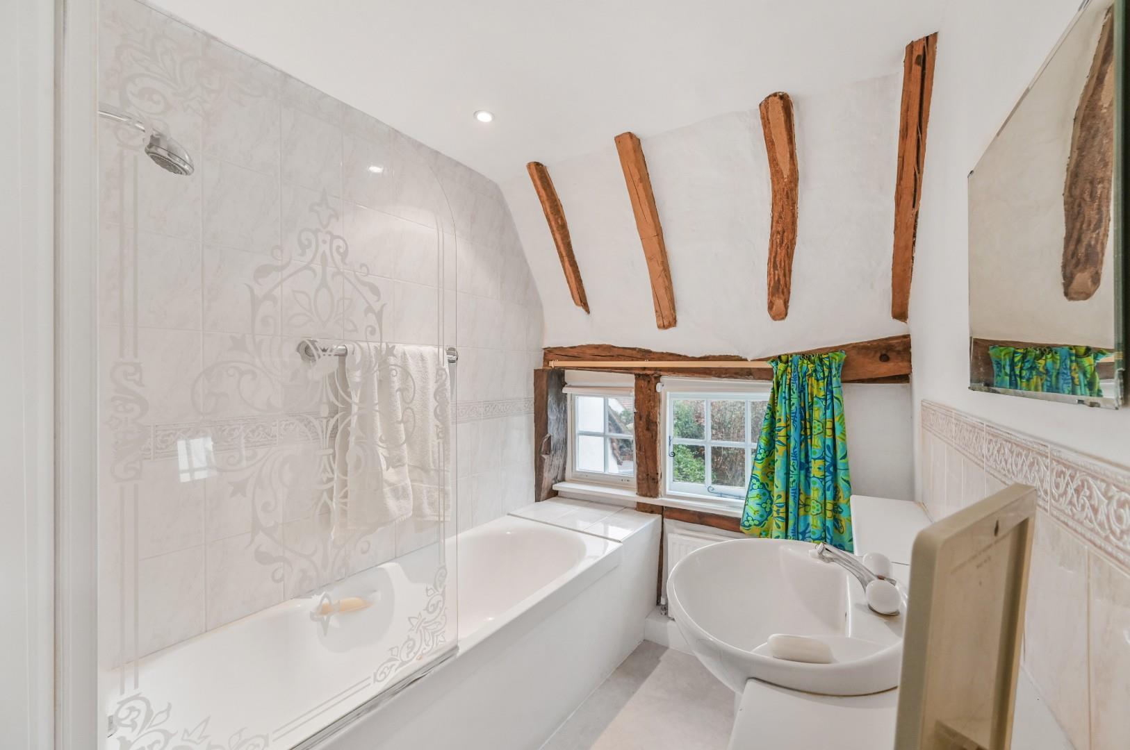 Bathroom - Window to rear aspect with secondary glazing, enclosed bath with mixer taps & shower attachment, wash hand basin with vanity unit, W.C, exposed timbers, inset spotlights.