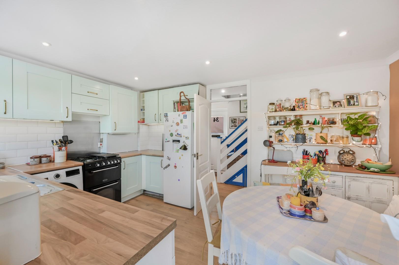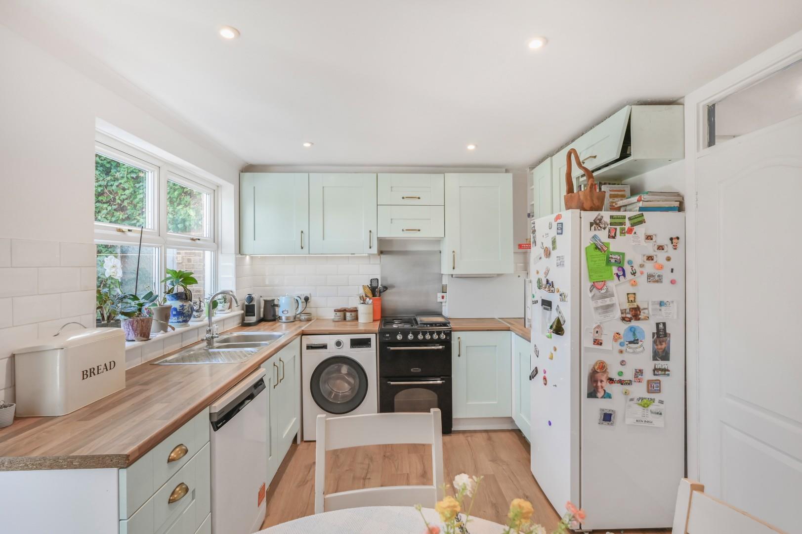 Kitchen/Diner - 4.47 x 3.07 (14'7" x 10'0") - Window to rear aspect, base and eye level units with working surface over, space for freestanding cooker with extractor above, one and half bowl sink with drainer unit, space for dishwasher, space for washing machine, space for fridge/freezer, inset spotlights, power points, radiator, wood laminate flooring, door to rear garden.