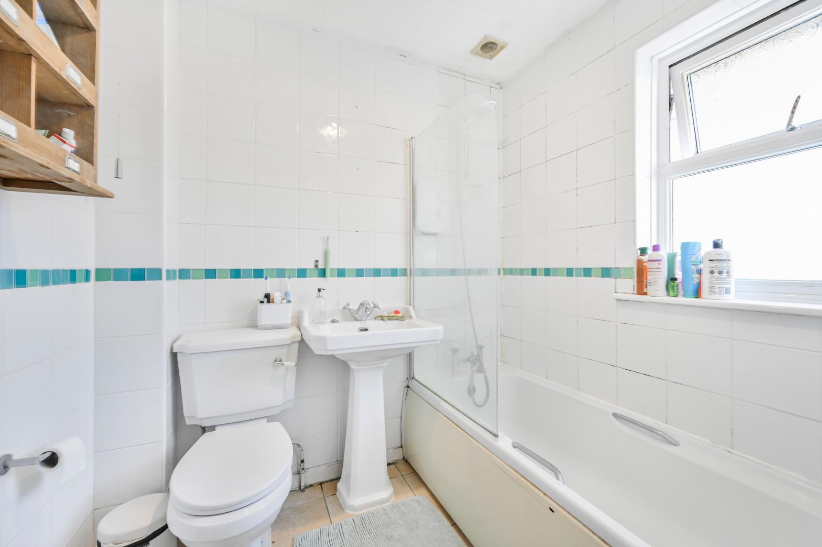 Family Bathroom - Opaque window to front aspect, fully tiled, enclosed bath with mixer taps & shower attachment, wash hand basin with pedestal, W.C, extractor fan.