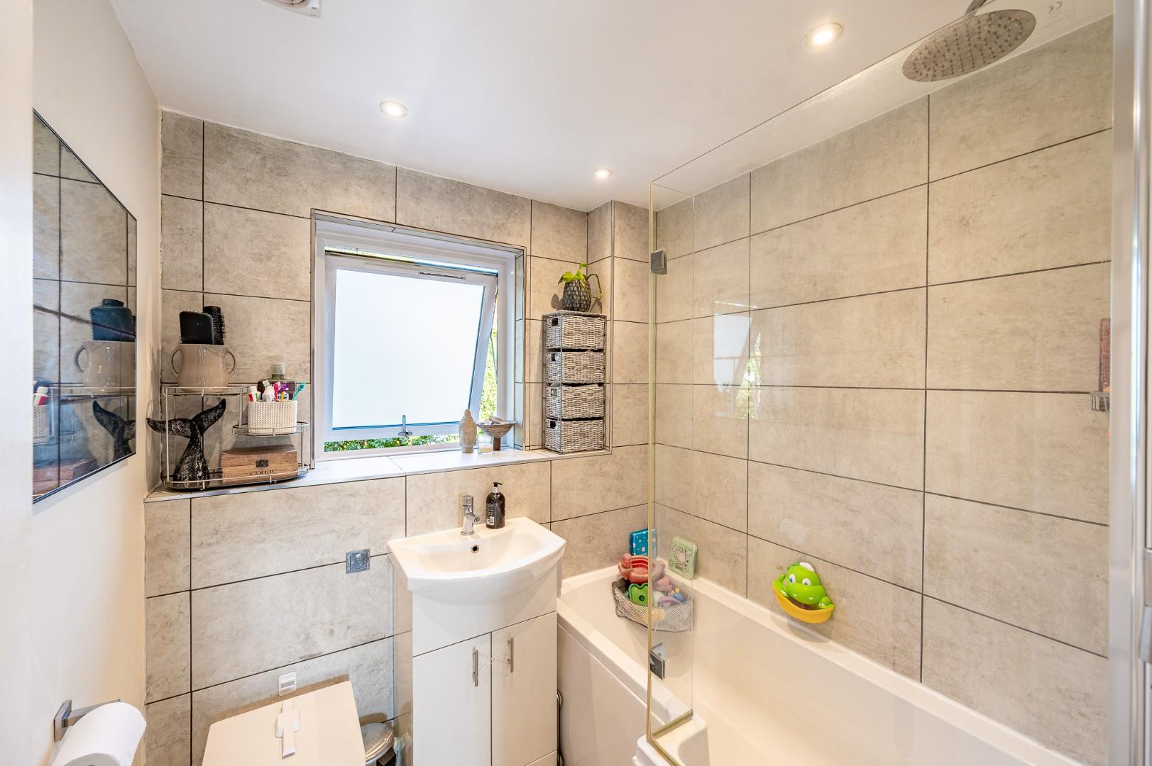 Bathroom - UPVC double glazed opaque window to rear aspect, fitted with three piece suite comprising 'P' shaped panel enclosed bath with wall mounted shower attachment with glass enclosure, wash hand basin with vanity unit and mixer tap over, low level W.C, wall mounted heated towel rail, fully tiled walls, wood effect flooring.