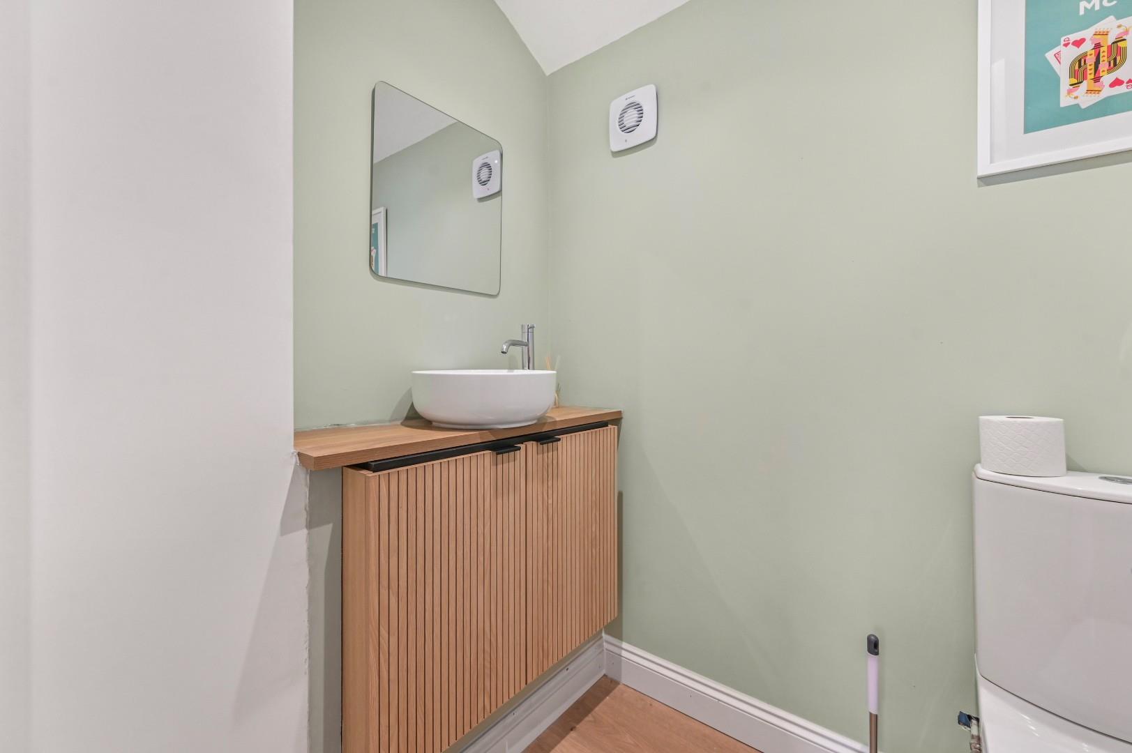 Cloakroom - wash hand basin with hand built vanity unit, low level W.C, extractor fan.