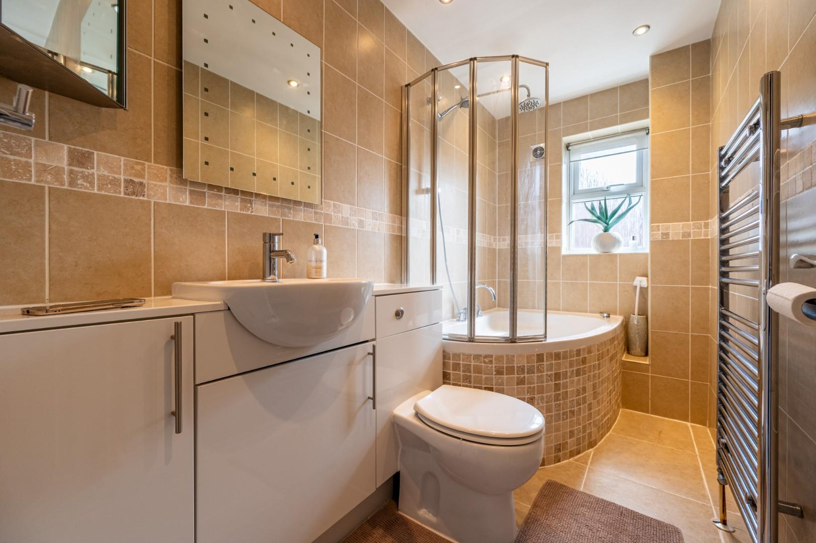 Family Bathroom - Opaque window to side aspect, fitted with a tile enclosed bath with wall mounted shower attachment and glass screen, wash hand basin and W.C in vanity unit, wall mounted heated towel rail, fully tiled flooring, fully tiled walls.