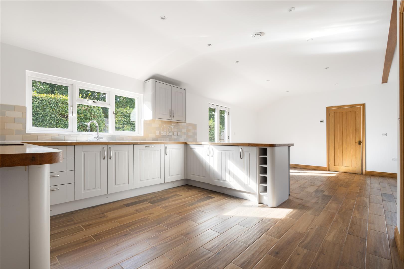 Kitchen - 4.0m x 3.6m (13'1" x 11'9") - Double glazed timber windows to rear aspect, various base and eye level units with varnished timber work surfaces over, one and a half unit stainless steel sink with mixer tap, integrated dishwasher, low level NEF fan oven, NEF four ring induction hob with extractor fan overhead, breakfast bar seating for four/five people, splash back tiling, solid oak fixtures and fittings, tiled flooring, inset spotlights, various power points. Opening to: Living Area