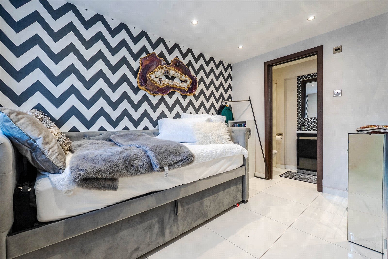 Patio doors open onto the landscaped rear garden, while a breakfast bar subtly divides the kitchen from the main living space. The kitchen is fitted with high-quality integrated appliances, including an American-style fridge freezer and wine fridge, all complemented by sleek quartz worktops. The ground floor also benefits from a generous bedroom with its own en-suite shower room, ideal for guests or multi-generational living. This space could equally be used as a study, for those who work from home.