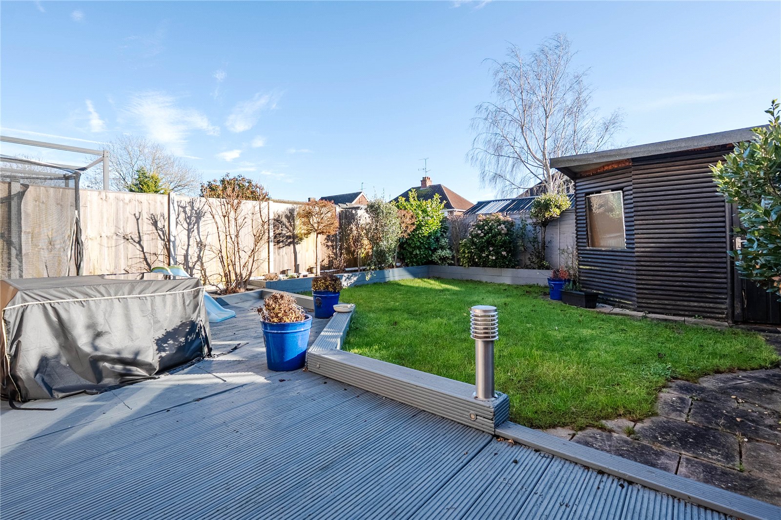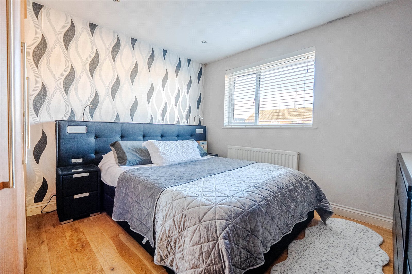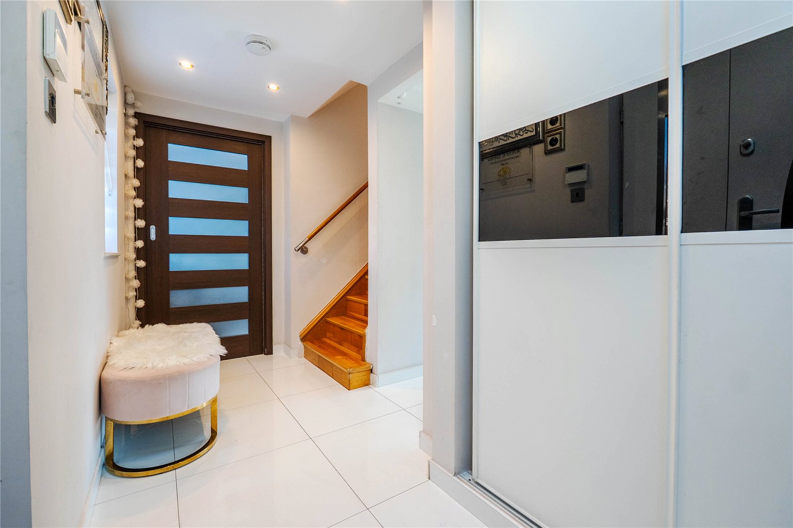 Upstairs, there are three well-proportioned bedrooms, all featuring built-in wardrobes. The contemporary family bathroom includes a corner bath, separate shower, and integrated storage.