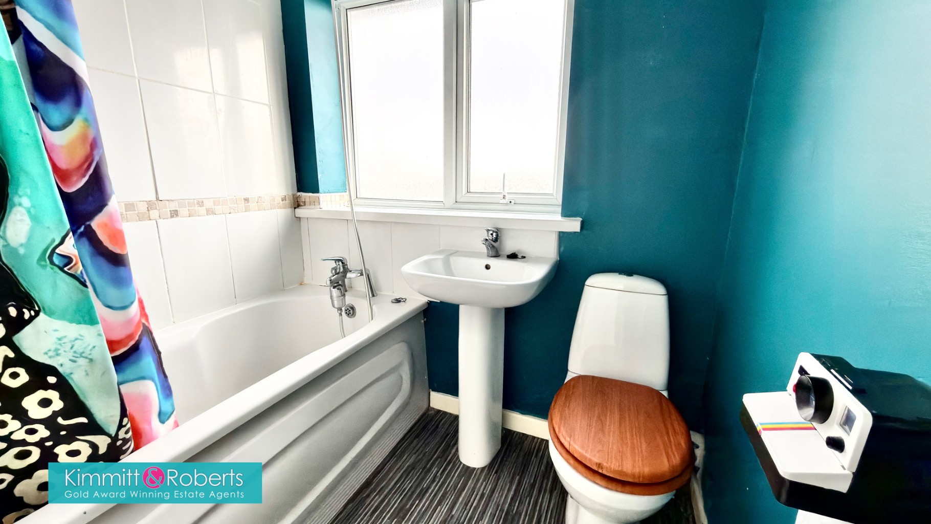 The family bathroom, located on the first floor, is fitted with a three-piece suite, including a bath with an overhead shower, a wash basin, and a WC. It is a functional space that caters to the needs of a busy household.