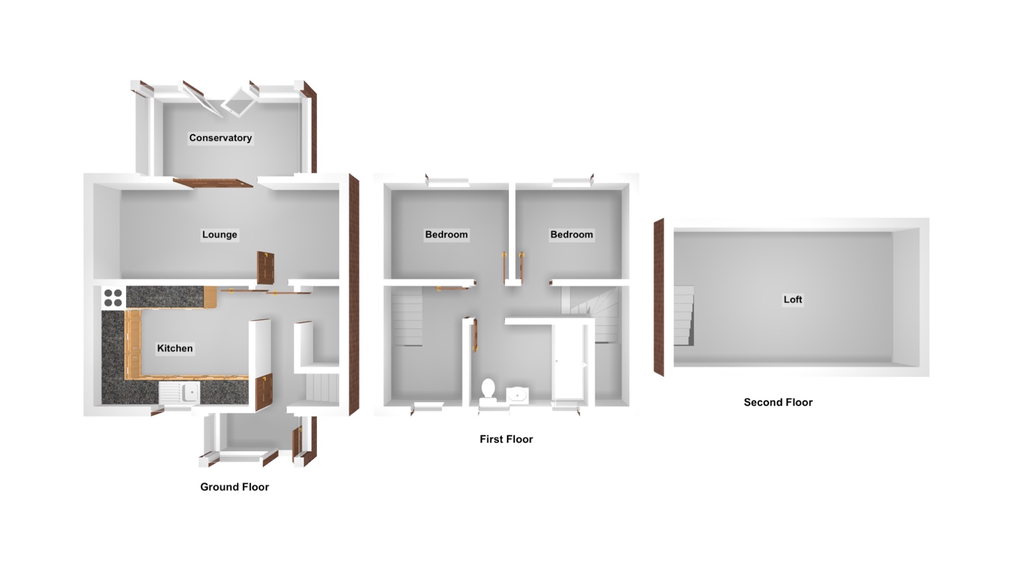 - First floor includes two double bedrooms, a dressing room, and stairs to a loft room.