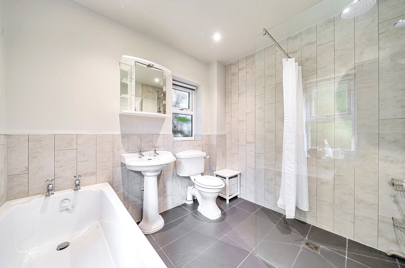 The spacious, well-presented accommodation includes an impressive 25ft dual aspect living/dining room, which currently has a full-size snooker table. The modern fitted kitchen has an integrated Bosch dishwasher and fridge freezer, a Bosch electric oven with induction hob, and direct access to a private patio. A separate utility room houses the Worcester gas boiler.