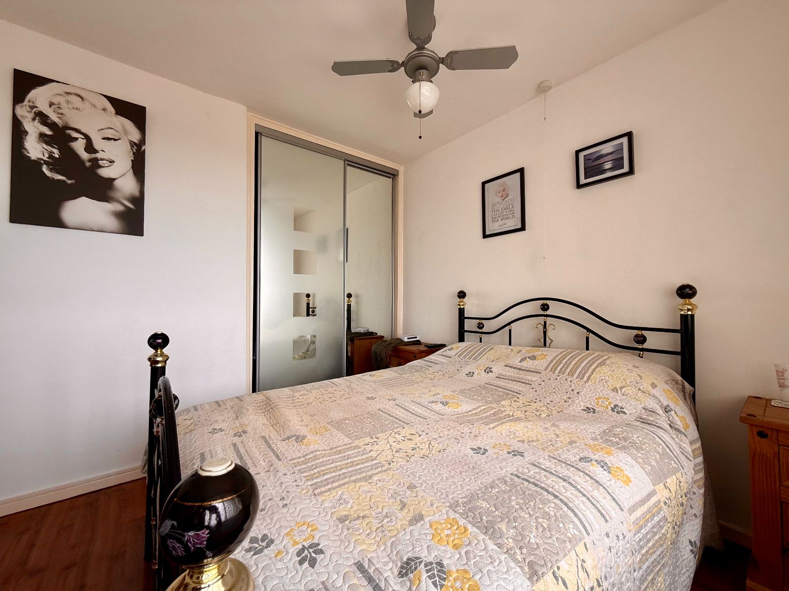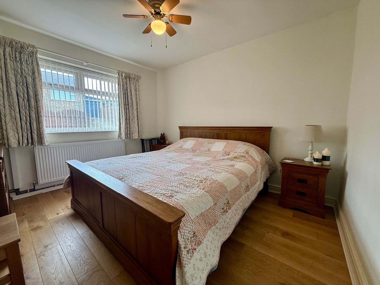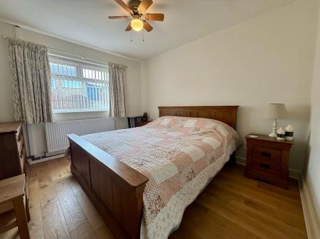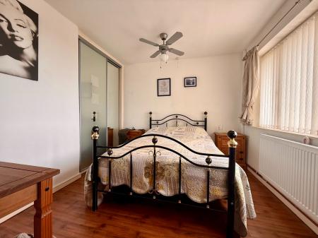 Window to rear with coastal views, ceiling fan and light, built-in double wardrobe, radiator, laminate floor.