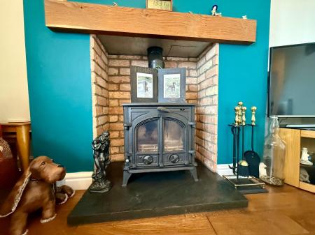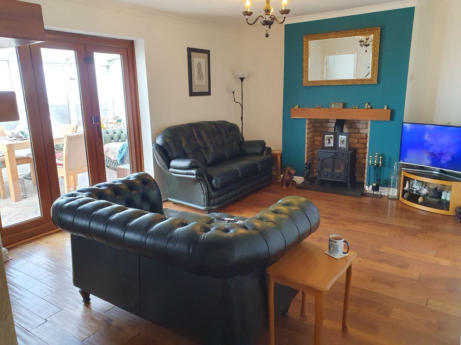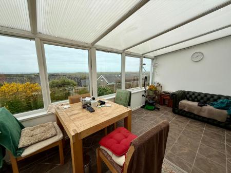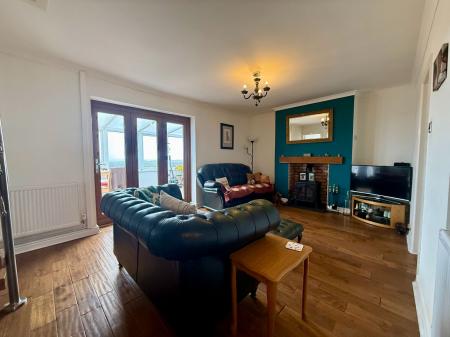 Bi-fold doors to rear with stunning coastal views, coved ceiling, feature open fireplace with woodburning stove on a slate hearth with oak mantle, 2 radiators.