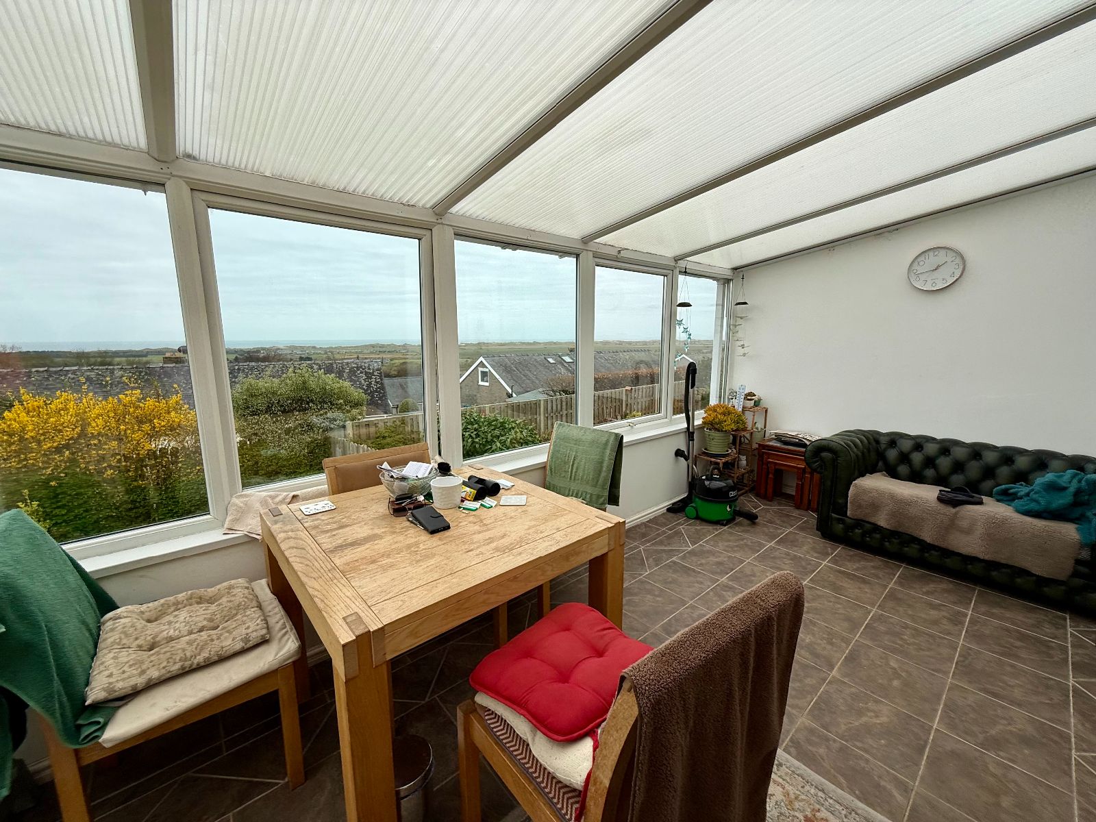 Triplex roof, French doors to side, 5 windows to front with stunning coastal views, wall lights, tiled floor.