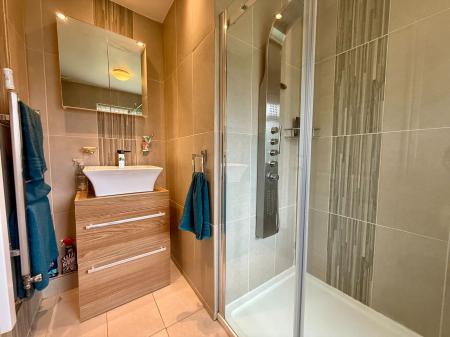 Window to front, fully tiled walls, large shower cubicle with jet system mains shower, low level W.C., vanity wash hand basin, mirrored cupboard, heated towel rail/radiator, tiled floor.