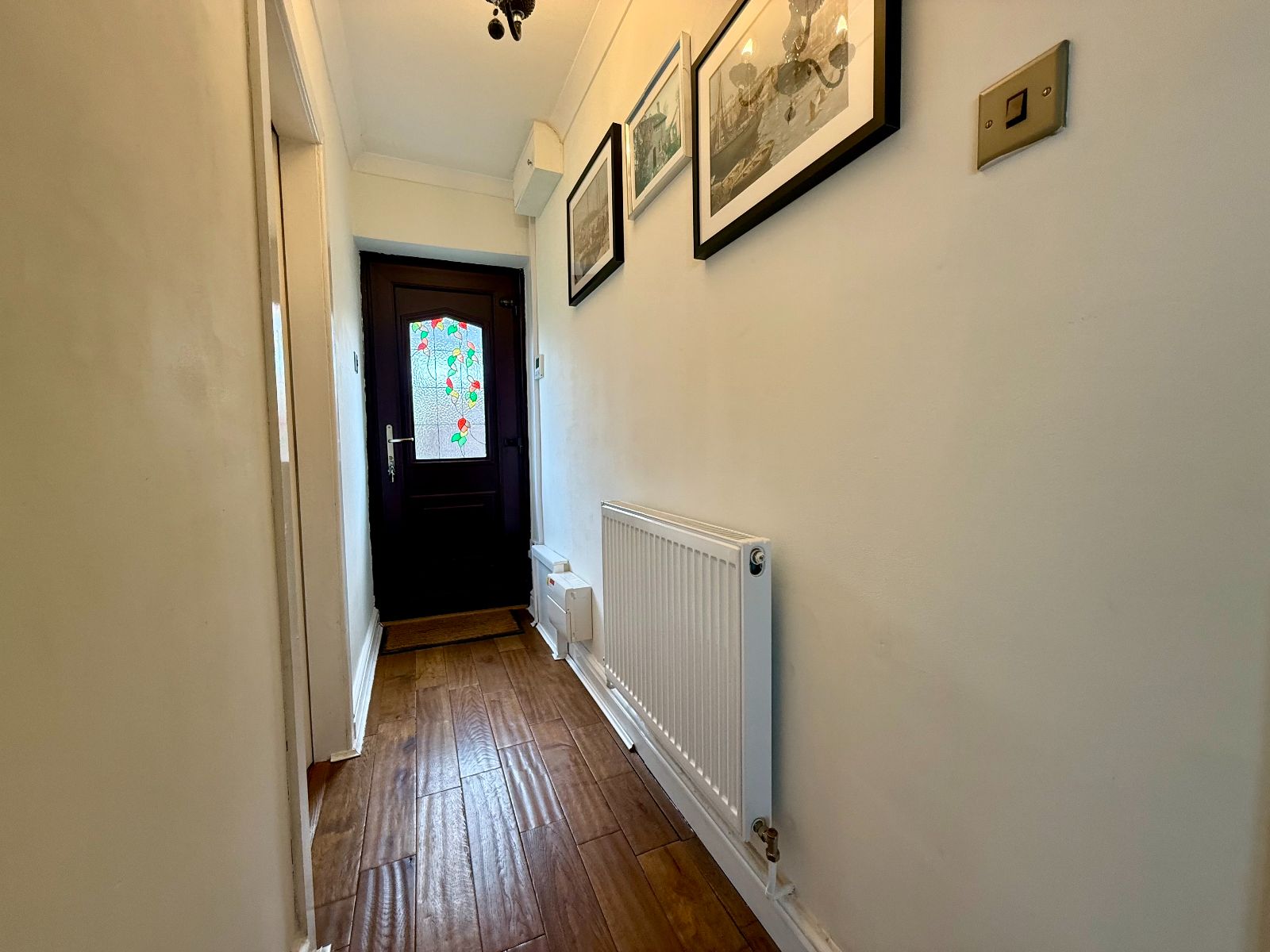 Door to front, radiator, oak flooring.