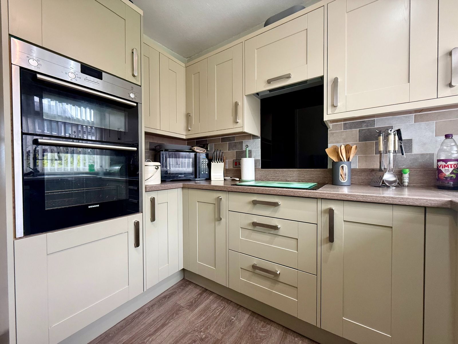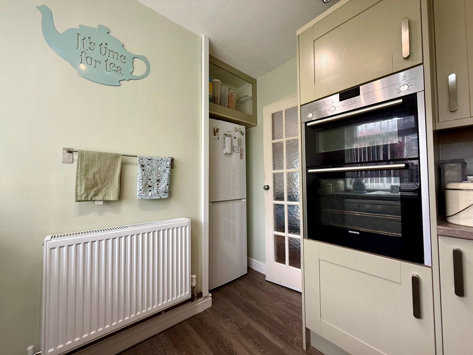 Window to front, fitted kitchen with 6 wall units, 7 base units under a timber effect worktop, 1 1/4 ceramic sink and drainer, space for dishwasher, tiled splash backs, integral eye level double oven, 4 ring induction hob, glass splash back and extractor hood above, space for fridge/freezer, radiator, laminate flooring.