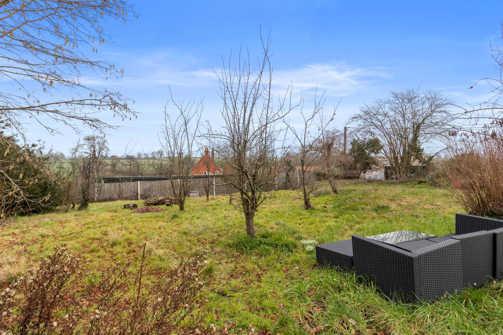 The rear garden is mainly laid to lawn and features a mature apple tree. It is accessed via stone steps from an unfinished yet generously sized patio, which provides a natural link between the garden and the rear of the property. To one side, a pathway leads along the house to the recently installed oil-fired boiler.