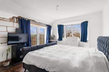 A spacious, dual-aspect bedroom with a double-glazed bay window to the rear aspect. Double-glazed sliding doors onto an oak-framed balcony with views across the Ledbury countryside (not signed off by Building Control). Ceiling light point. Wooden floorboards. Column radiator. Door into landing cupboard (intended to become an en suite).