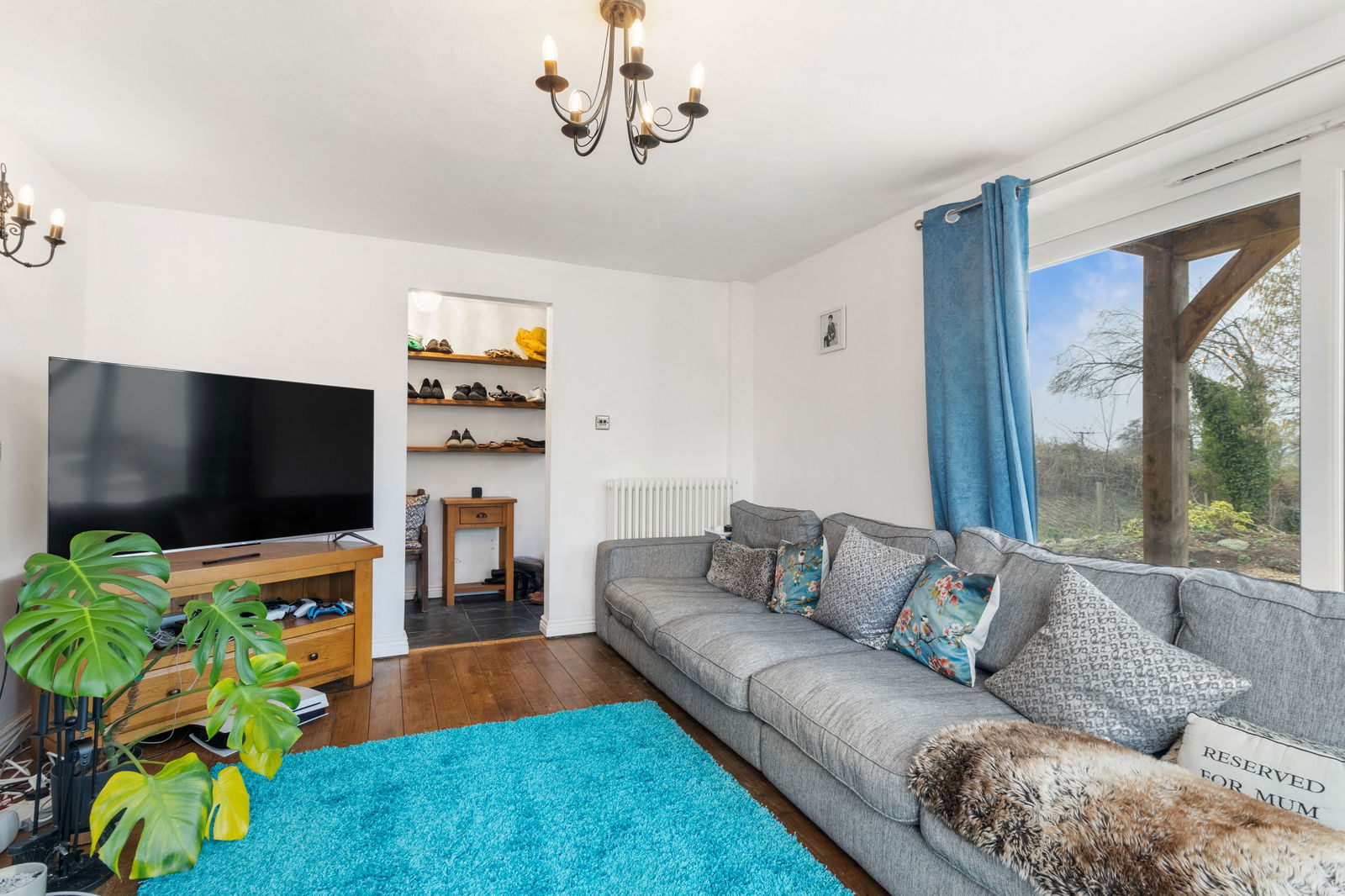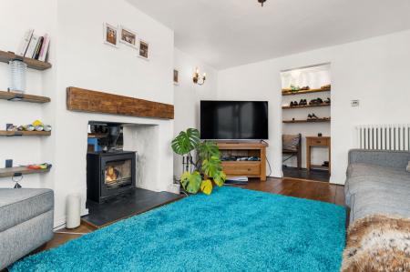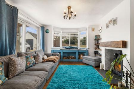 With ceiling light point. Two wall lights. Double-glazed sliding door opening onto the gravelled driveway. Double-glazed bay window to the rear aspect with fitted blinds and bench seating with storage beneath. Column radiator. Feature double-sided wood burner with a slate hearth and wooden mantel. TV point.