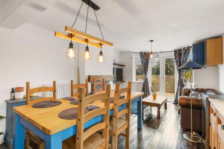 With two feature pendant lights. Wooden floorboards. Double-glazed bay window to the rear aspect with French doors opening onto the rear patio. Double-glazed obscure glass door to the side access. Double-sided wood burner with slate hearth. Wall cupboard units. TV point.