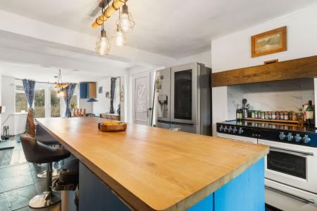 A wooden shaker-style kitchen with a large feature island with wooden countertop. A range of wall units with wooden countertops and an inset double Belfast sink with mixer tap. ‘Belling’ electric range-style cooker with five-ring electric hob and plate-warming compartment, set within a tiled surround. Overhead extractor fan recessed into the chimney breast. Half-tiled walls. Space for fridge freezer, washing machine and dishwasher. Double-glazed window to the front aspect. Feature pendant lighting over the island. Open through to…