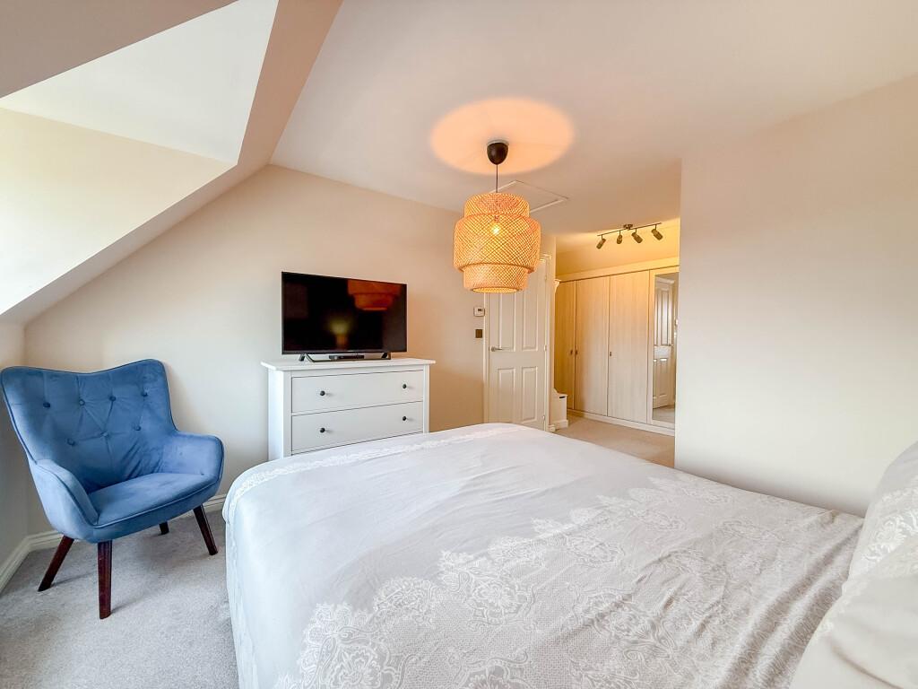 The first floor hosts a spacious double bedroom, a modern three piece family bathroom and a charming third bedroom with decorative wall panelling. The entire top floor is dedicated to an impressive principal suite, complete with a generous double bedroom, dressing area with fitted storage and a contemporary shower room.