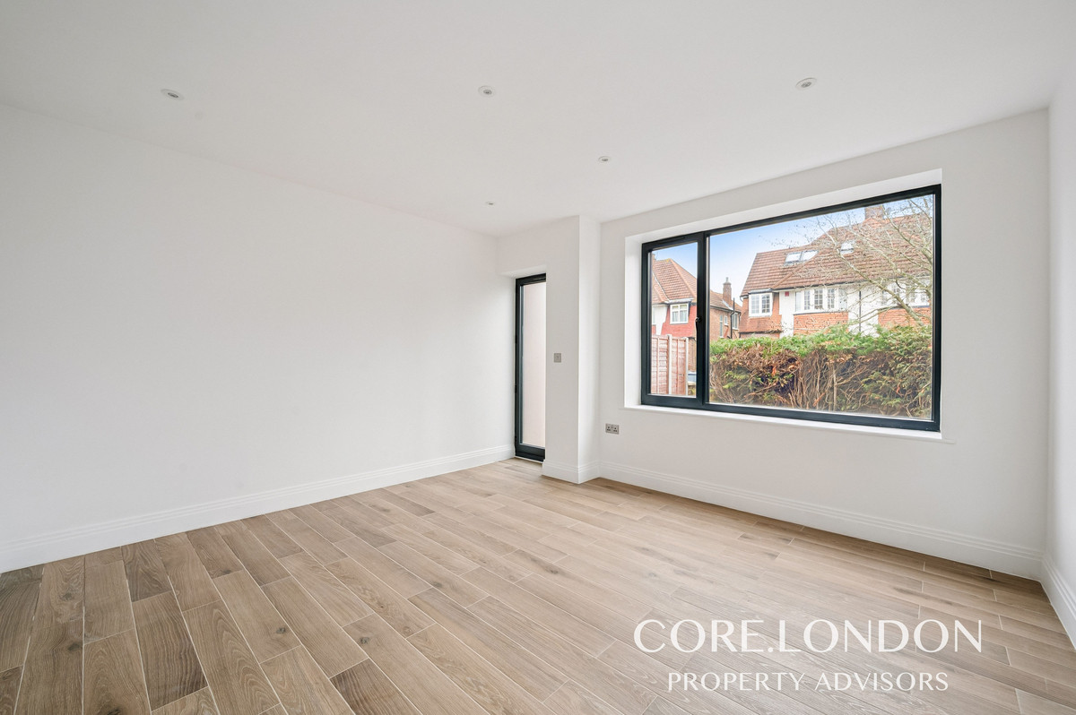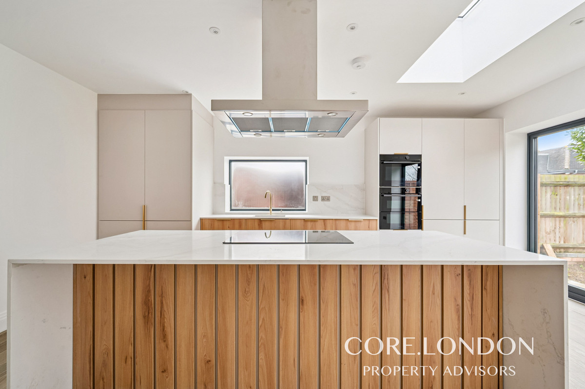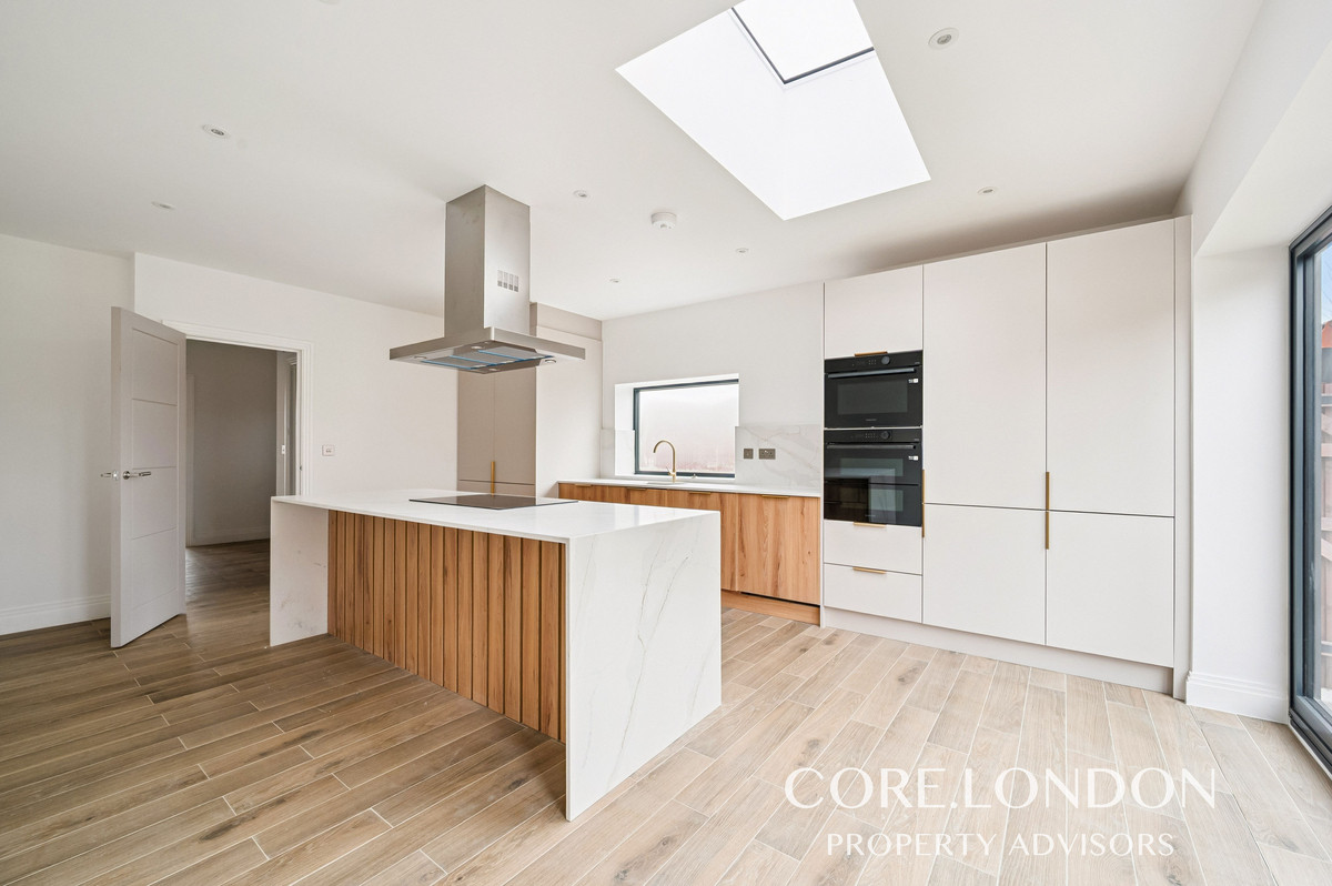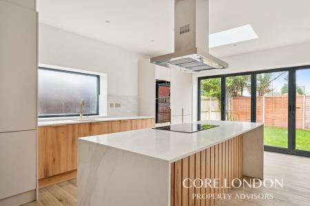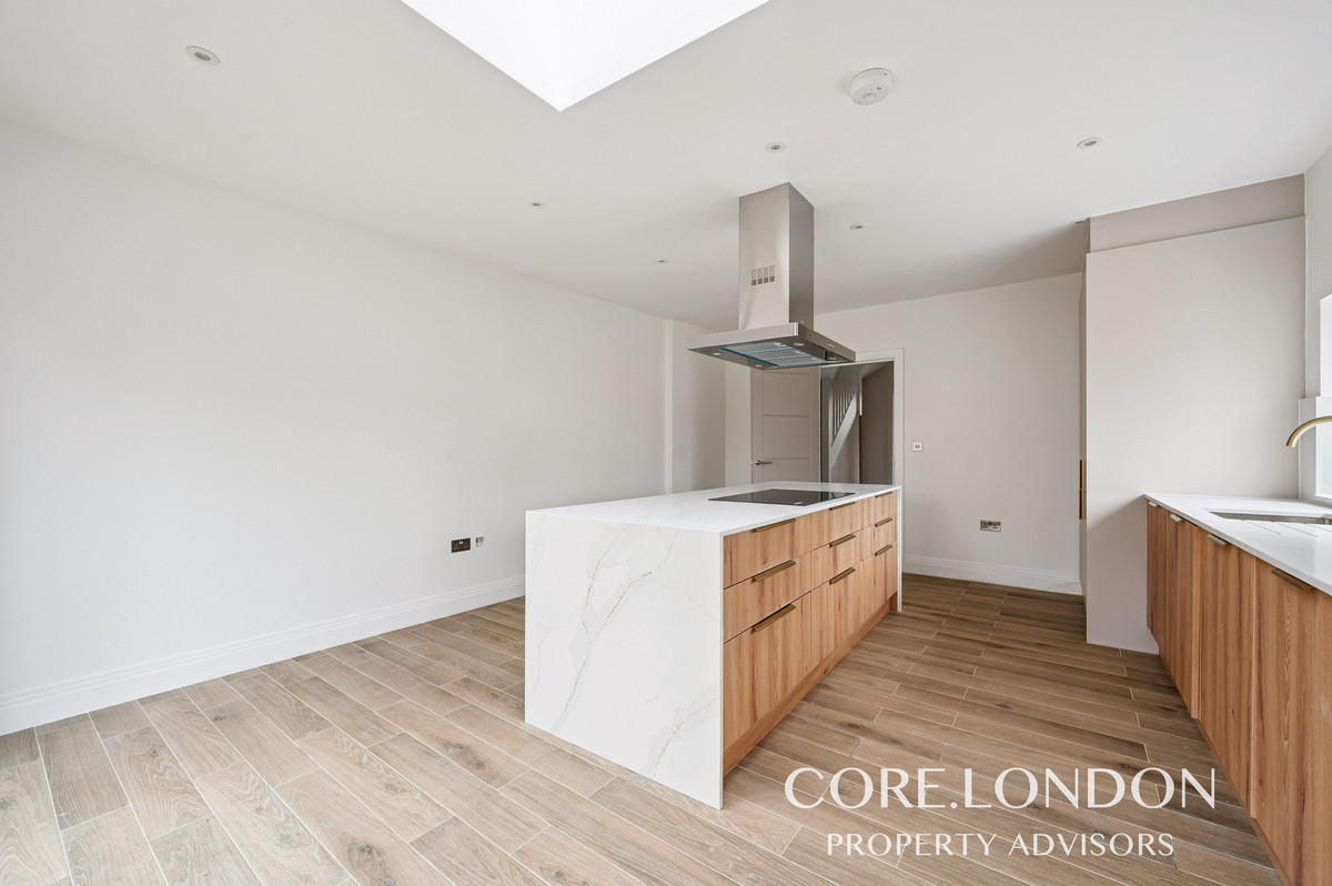The ground floor centres around an impressive open-plan kitchen, dining and living space, finished with bespoke cabinetry, stone worktops and integrated appliances. A large central island creates a natural focal point for everyday living and entertaining, while full-height glazing opens directly onto the private rear garden, providing a seamless connection between inside and out. To the front of the house is a separate reception room, ideal as a second living space, snug or home office, alongside a guest WC.
