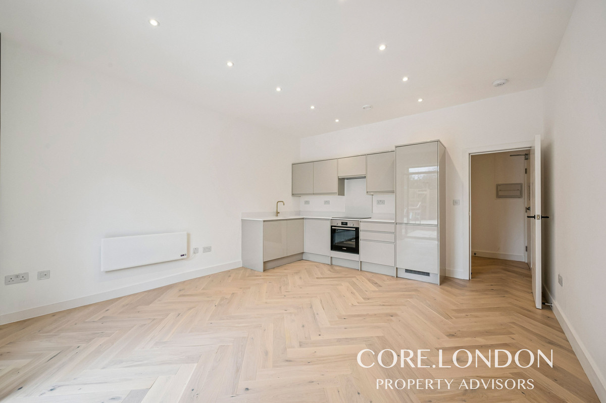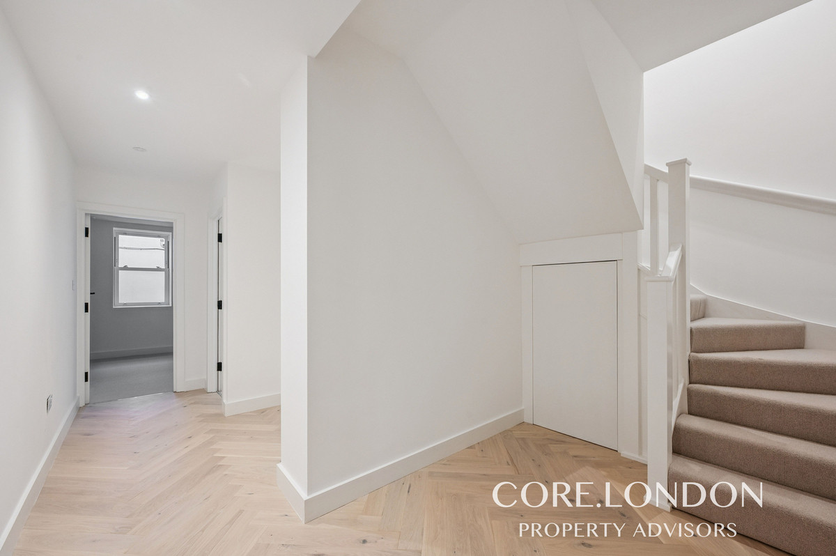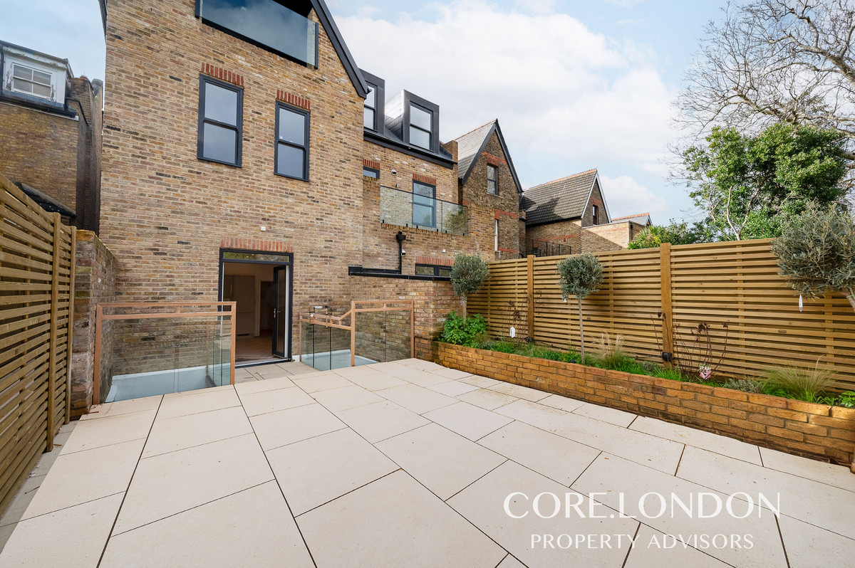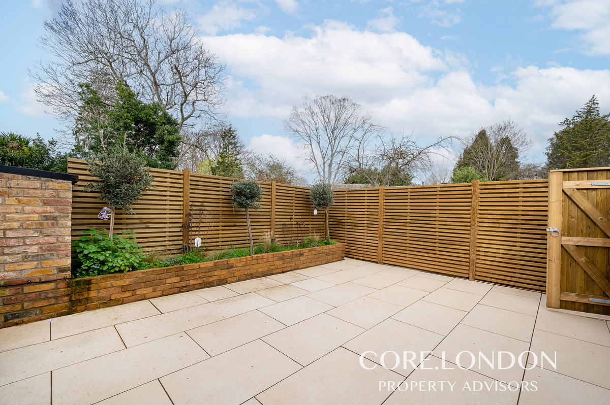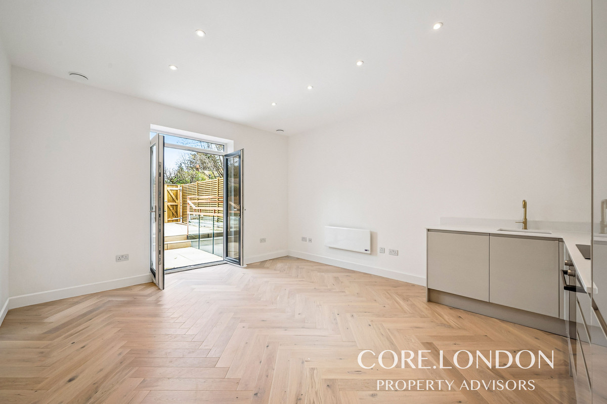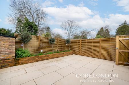 The ground floor is centred around a spacious open-plan kitchen and reception room measuring over 17 ft in width. Designed with both everyday living and entertaining in mind, this bright living space opens directly onto a private landscaped garden through wide glazed doors. The garden features a large stone terrace with raised planting beds and timber screening, creating a private and low-maintenance outdoor space that feels like a natural extension of the home.