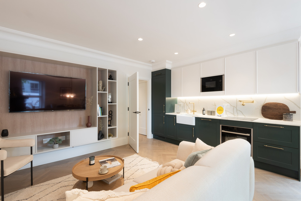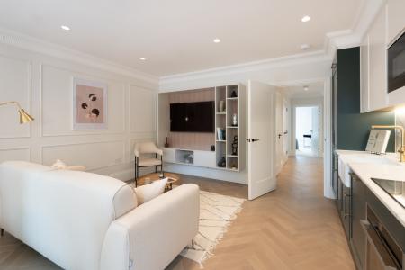 This apartment offers a well-balanced open-plan kitchen, living and dining space. The kitchen is well designed with stone worktops, integrated appliances and good storage, alongside built-in joinery within the living area. There is herringbone flooring throughout, ceiling coving and panelled doors. The bathroom is modern and finished with large-format tiling, a wall-mounted vanity and contemporary fittings.