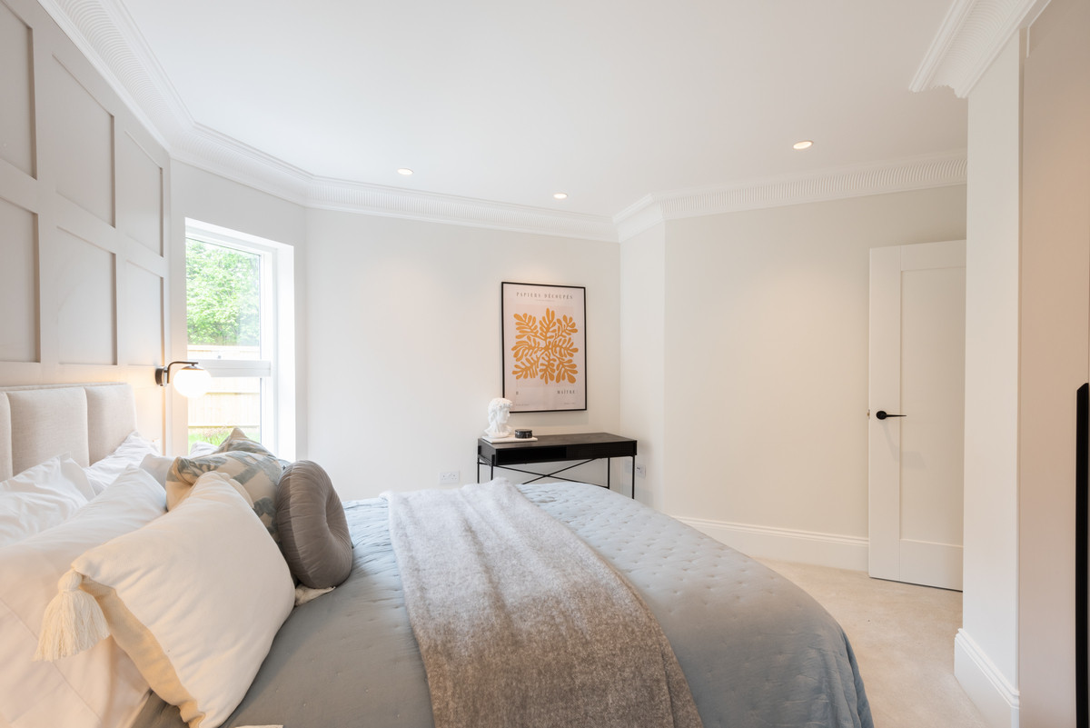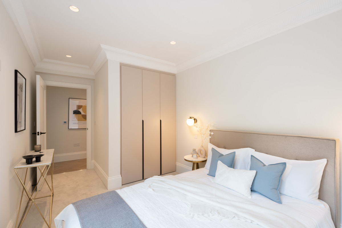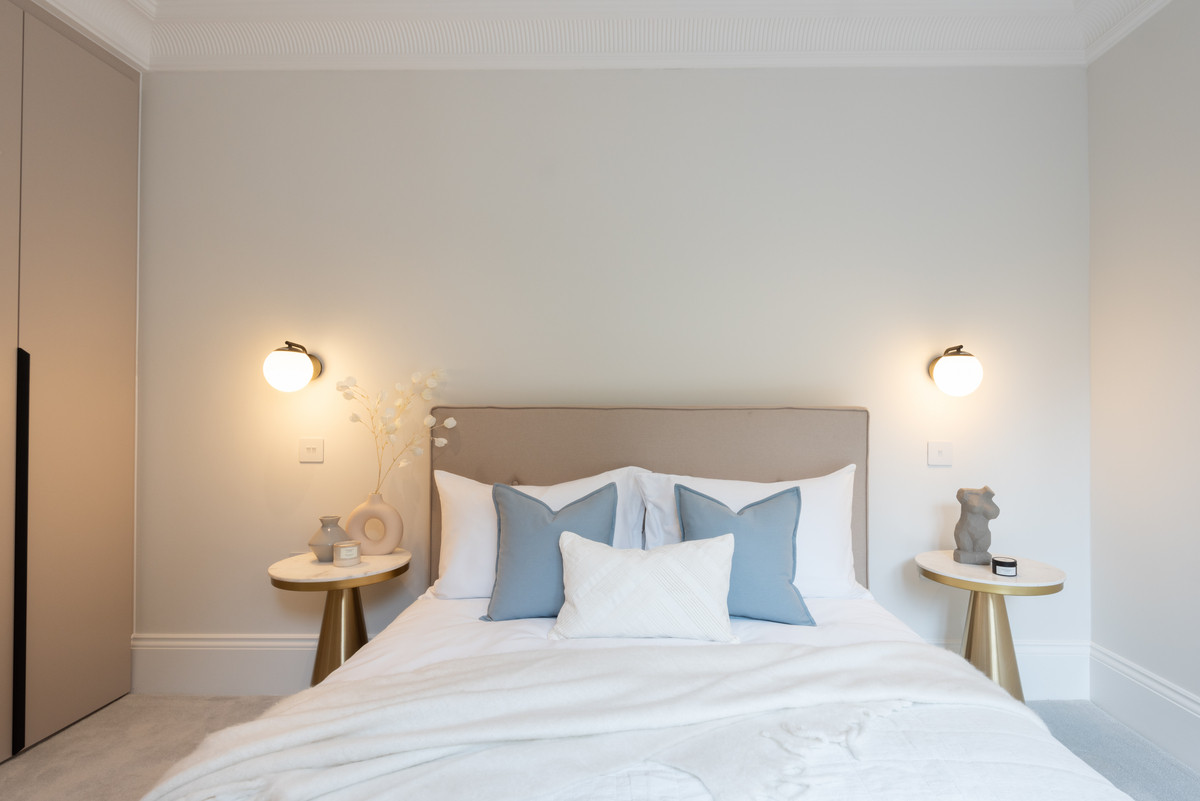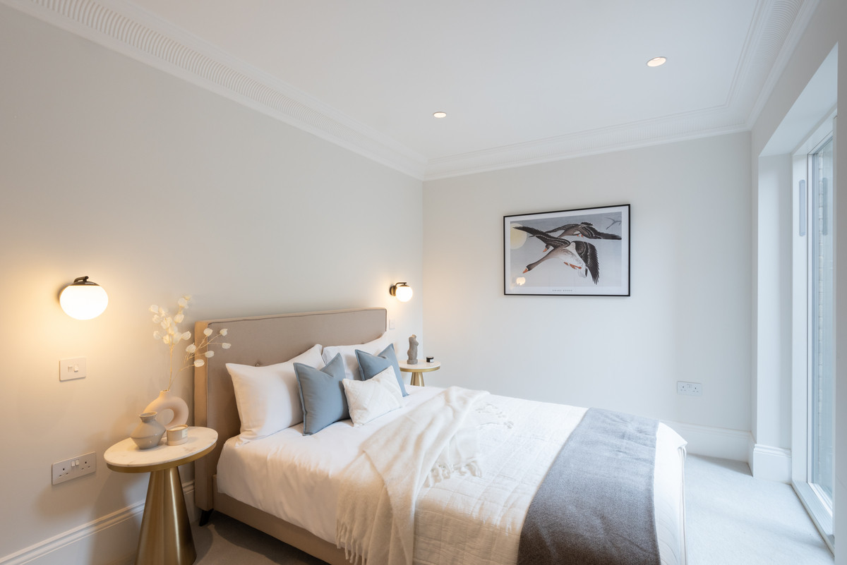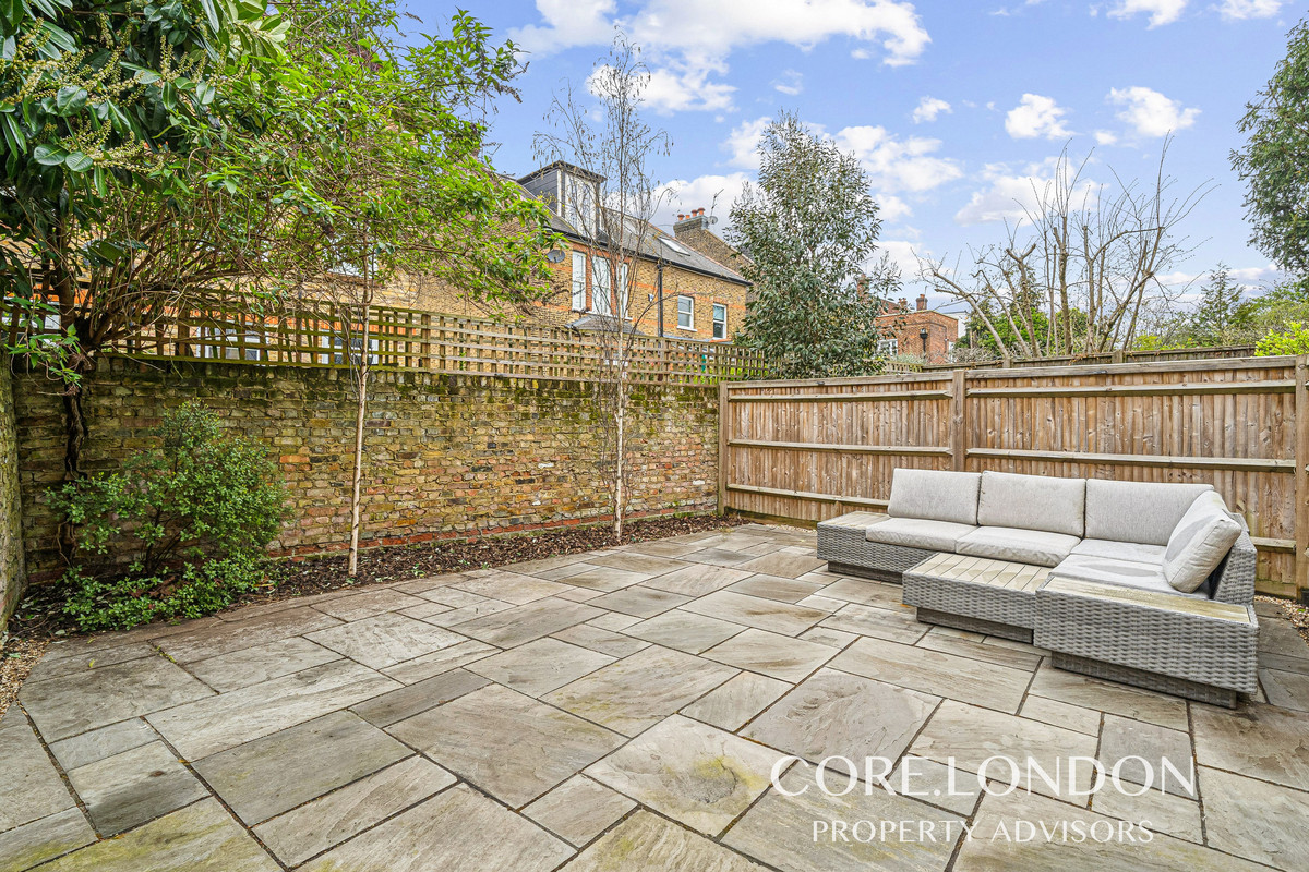 Both bedrooms are well proportioned, with fitted wardrobes and wall panelling. The private rear garden is one of the standout features of the apartment, finished with Indian sandstone and feature wall lighting.