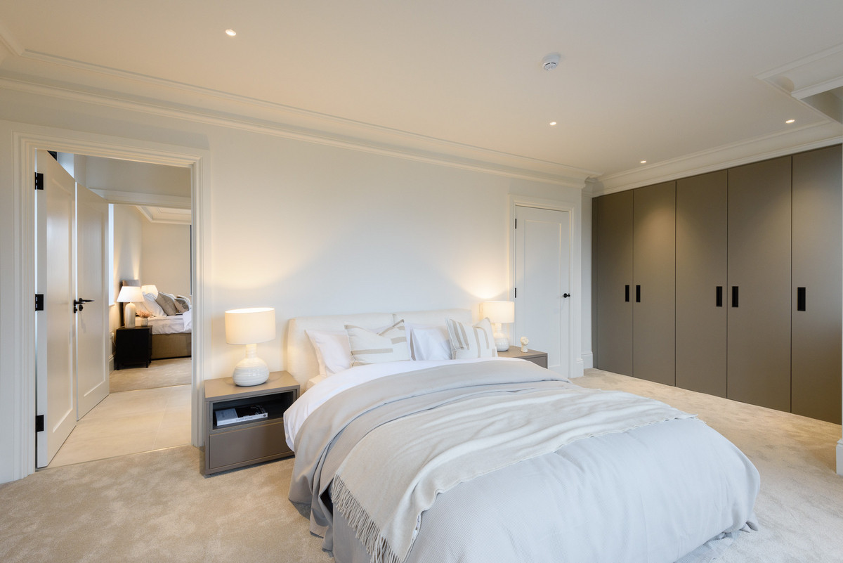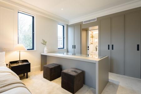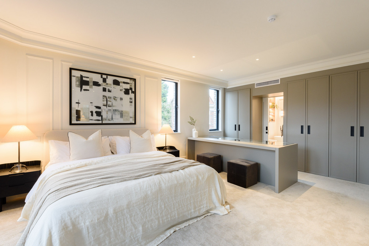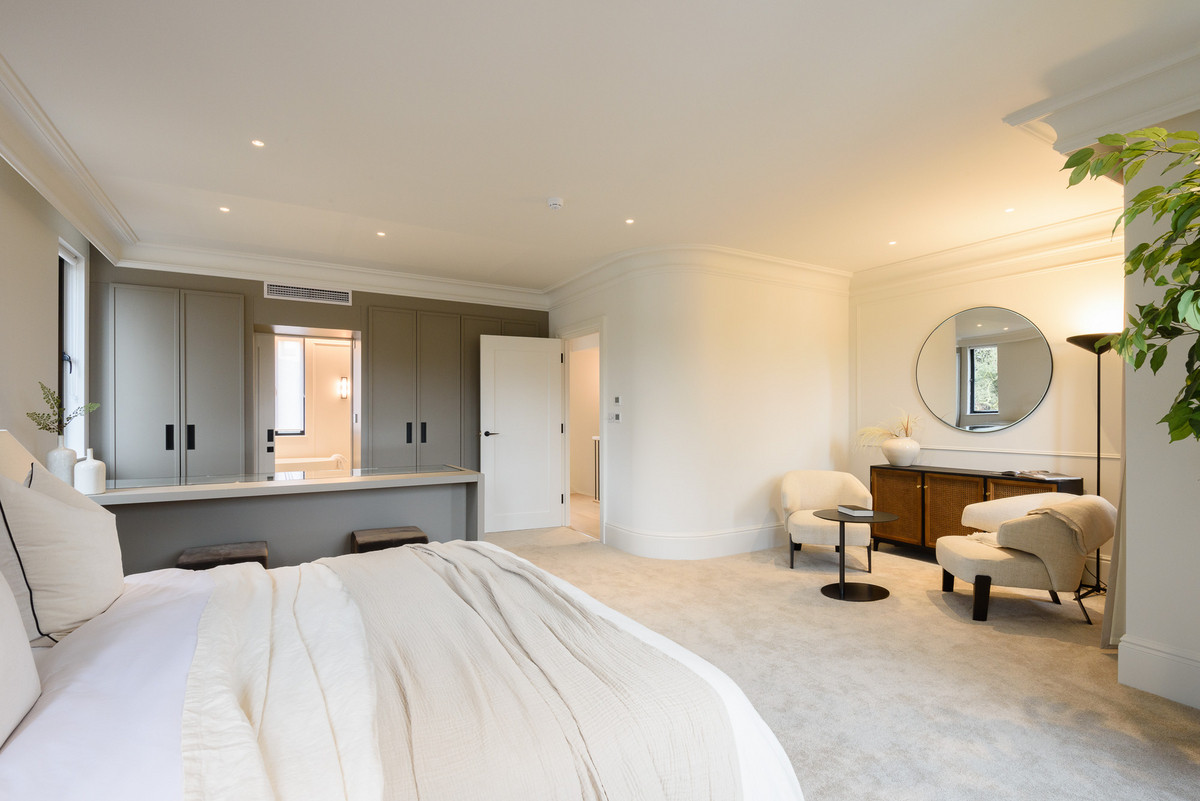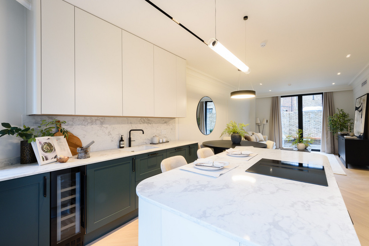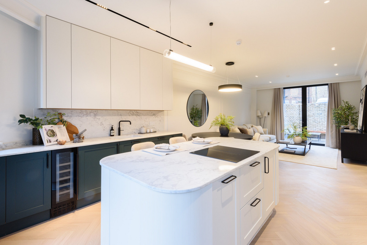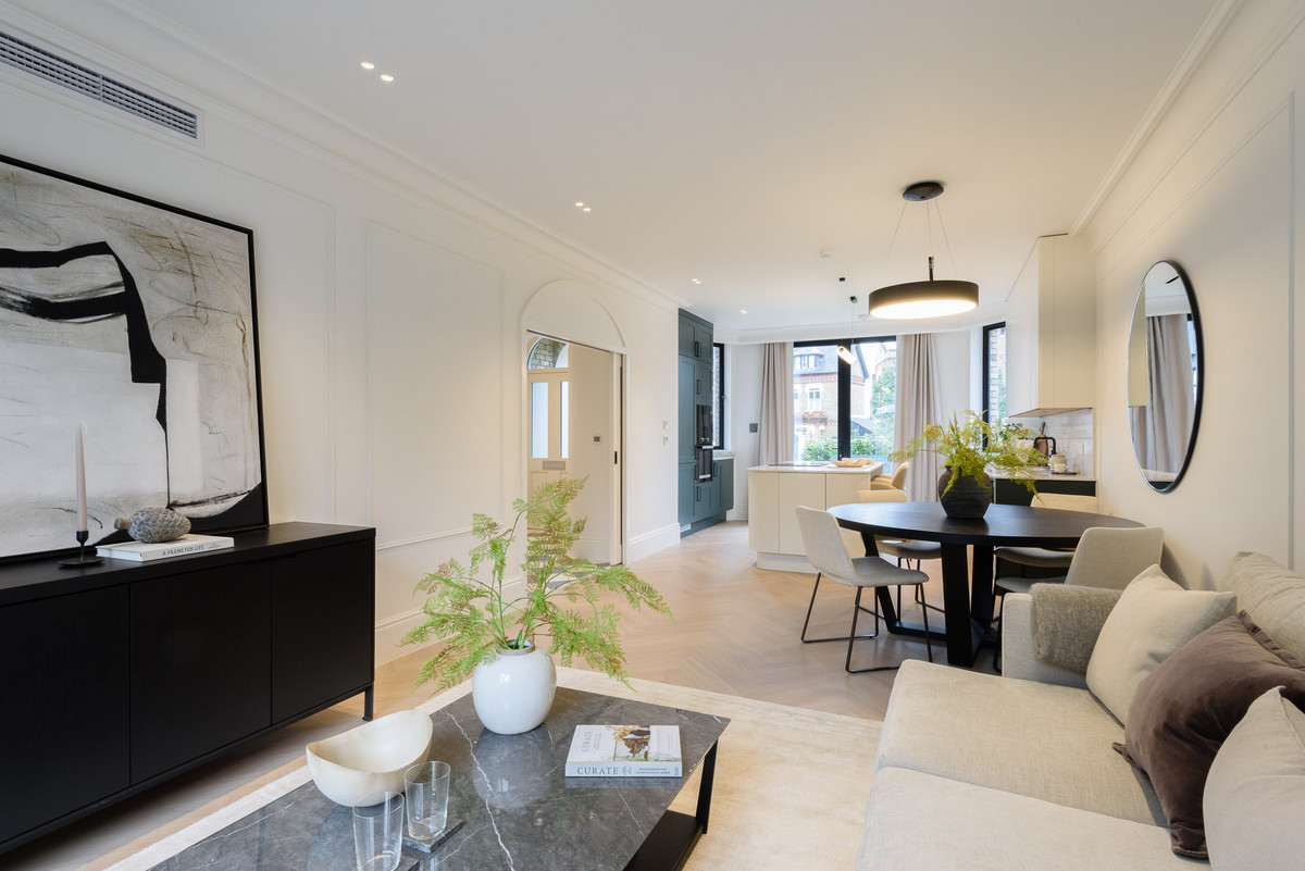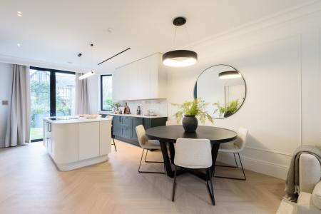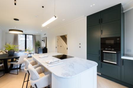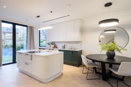 The open-plan living areas, bathed in natural light, flow seamlessly, providing the perfect setting for both entertaining and relaxation. The bespoke shaker kitchens, in a refined grey-green, feature ivory modern panelled islands, Miele appliances, marble-inspired worktops, and full splashbacks, catering to the most discerning chefs. Opulent wood detailing and matte black accents throughout lend an unmistakable air of refinement