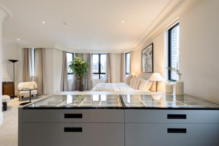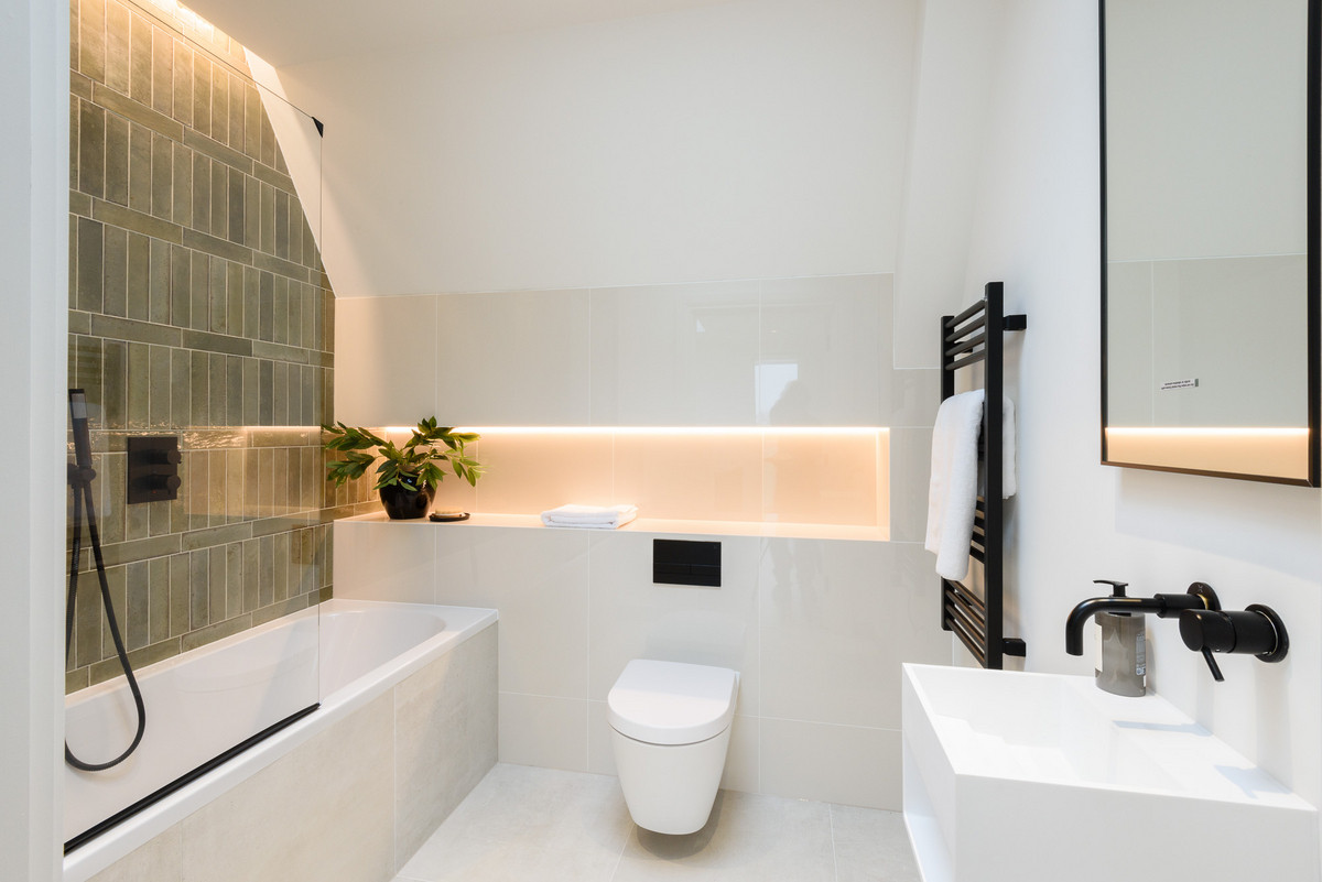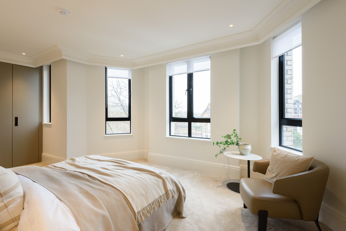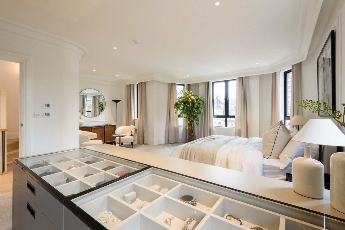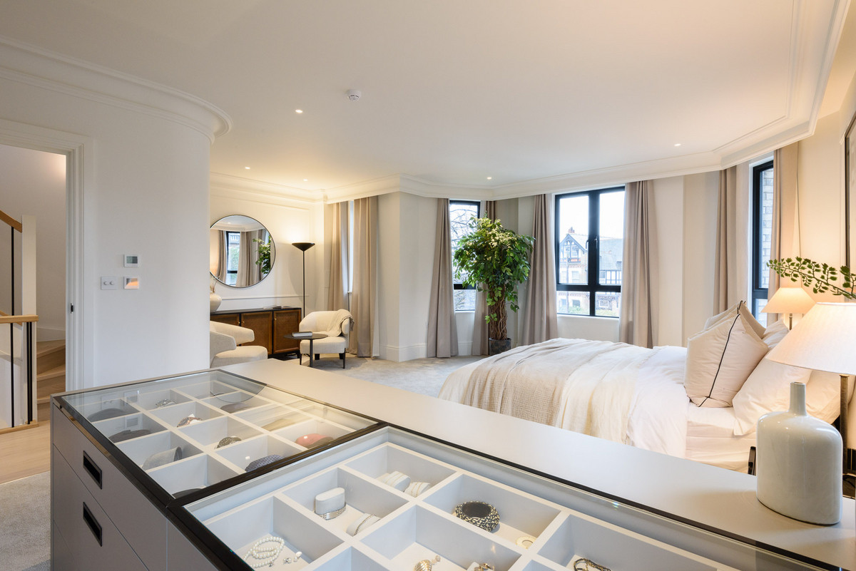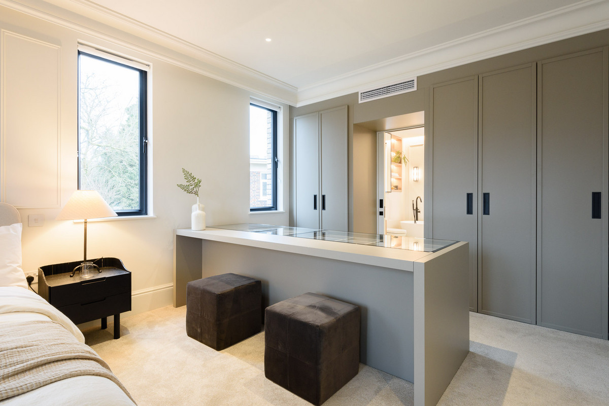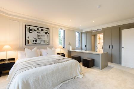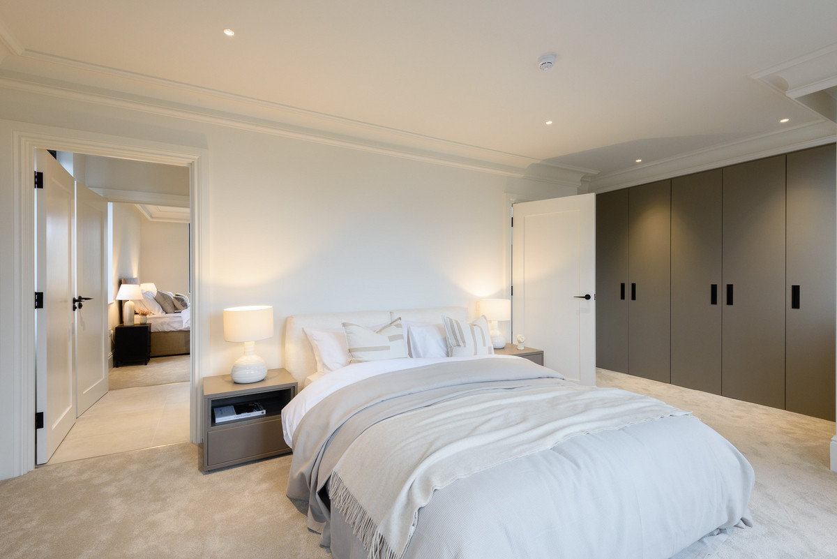 The open-plan living areas, bathed in natural light, flow seamlessly, providing the perfect setting for both entertaining and relaxation. The bespoke shaker kitchens, in a refined grey-green, feature ivory modern panelled islands, Miele appliances, marble-inspired worktops, and full splashbacks, catering to the most discerning chefs. Opulent wood detailing and matte black accents throughout lend an unmistakable air of refinement