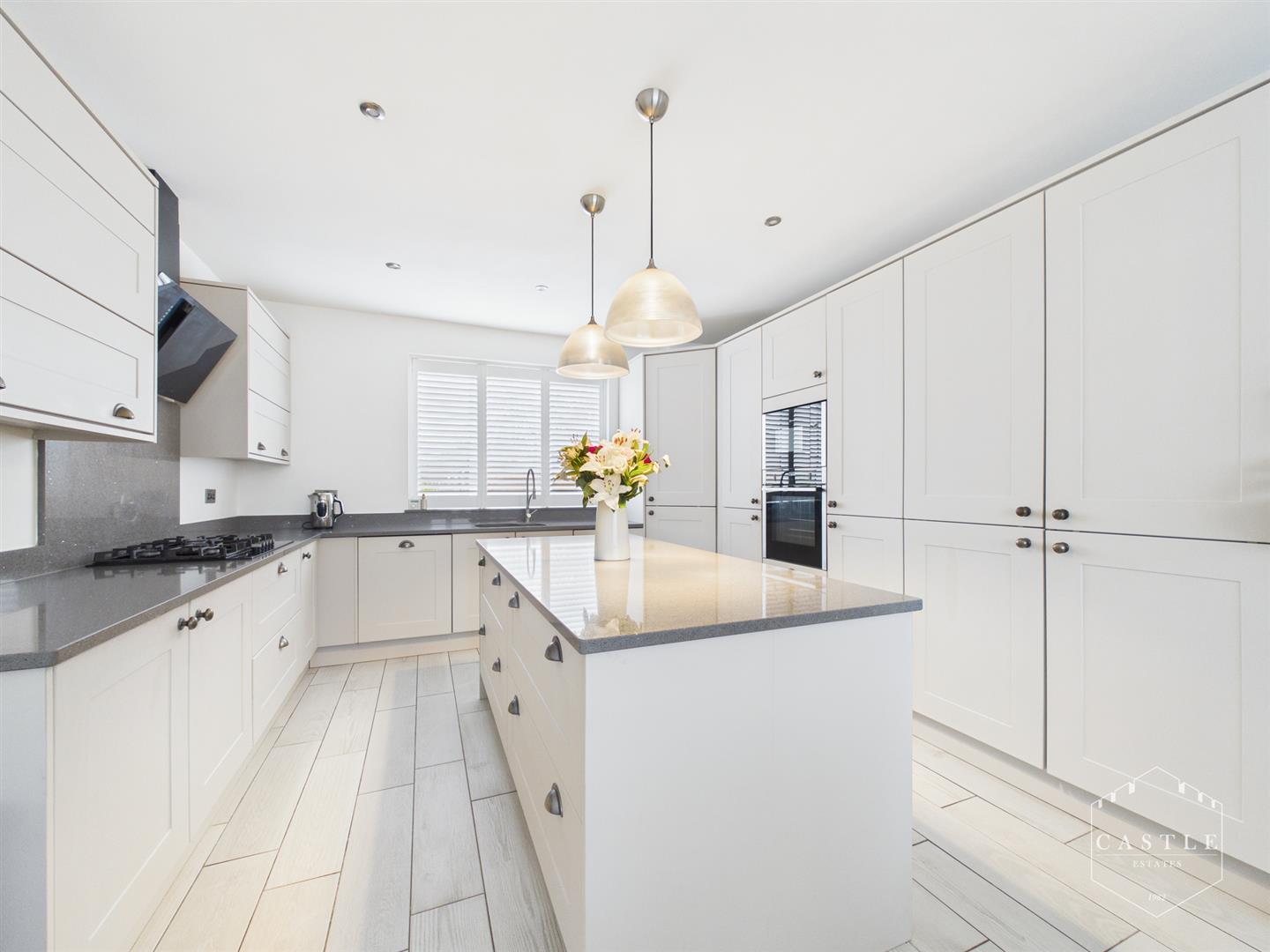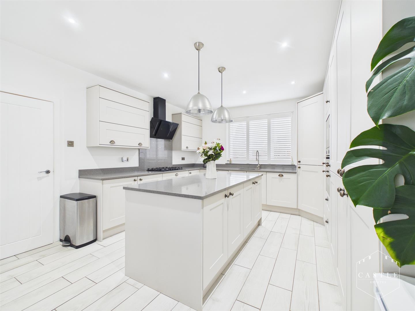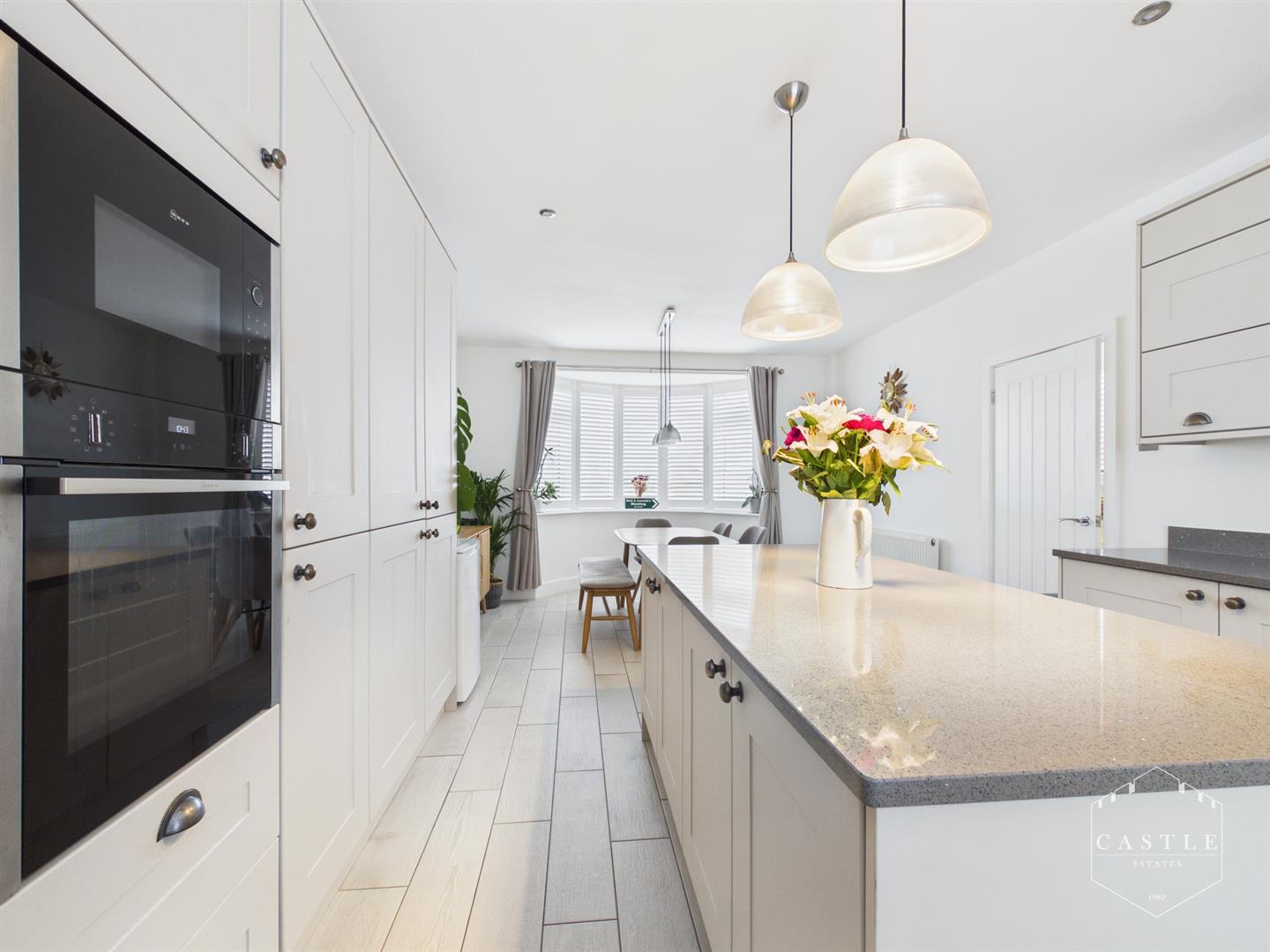 having an excellent range of contemporary fitted units including base units, drawers and wall cupboards, Quartz work surfaces and upstands with inset sink with mixer tap, built in oven, gas hob with cooker hood over, integrated dishwasher, integrated washing machine, integrated fridge freezer, matching island unit with drawers beneath, central heating radiator, wood effect flooring, inset LED lighting, upvc double glazed bow window to front and upvc double glazed window to rear.