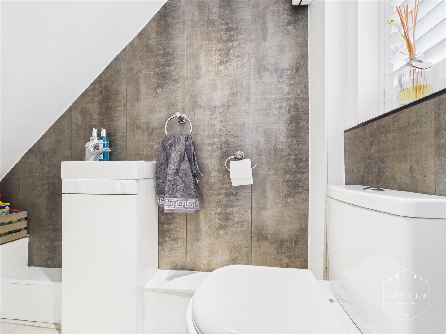 Guest Cloakroom - having low level w.c., vanity unit with wash hand basin, central heating radiator and upvc double glazed window with obscure glass.