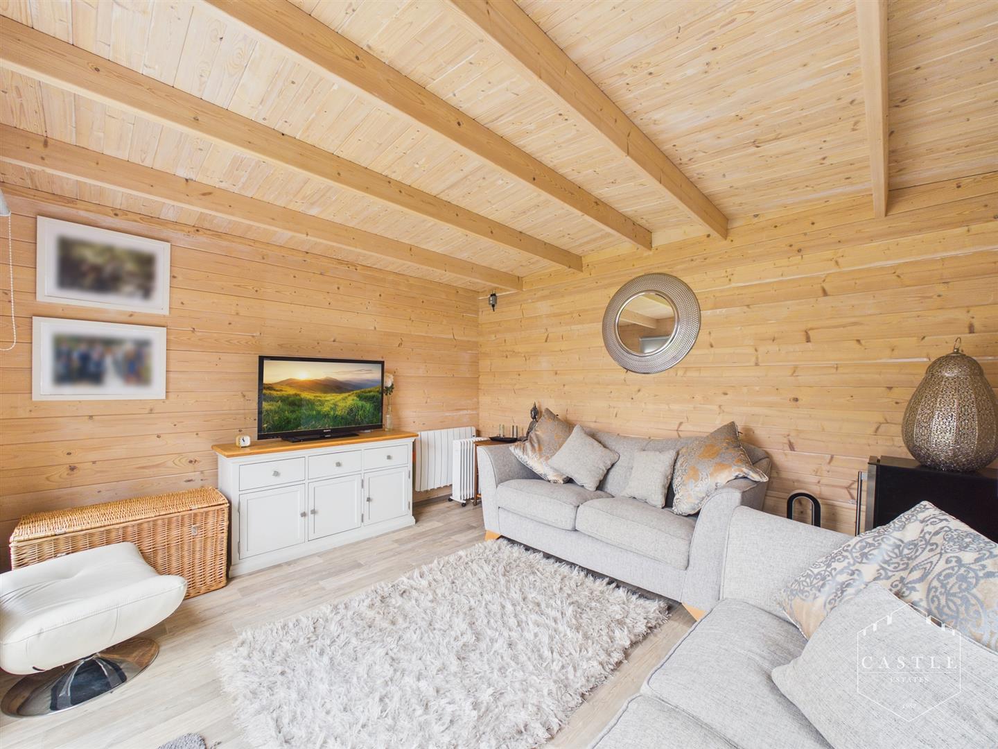 Outside - Summer House/Cabin - 3.91m x 3.40m (12'10 x 11'2) - being panelled throughout having tv aerial point, wood effect flooring, wall mounted heater, upvc double glazed windows and double doors opening onto garden.