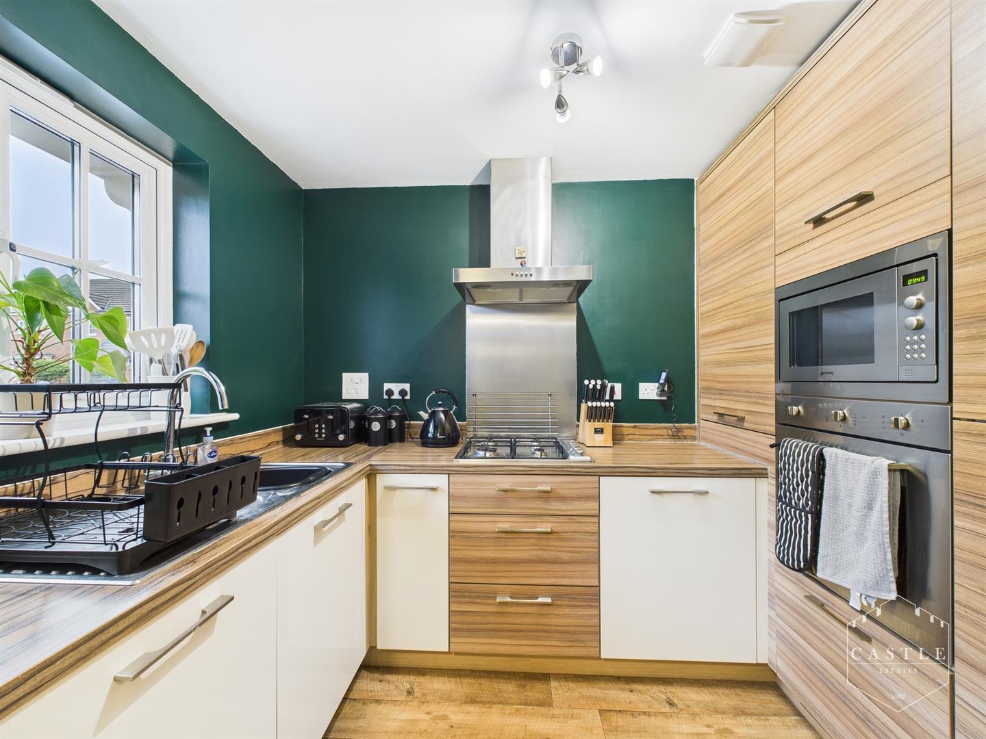 Kitchen - 2.74m x 1.90m (8'11" x 6'2" ) - having an attractive range of contemporary fitted units including base units, drawers and wall cupboards, matching work surfaces and upstands, inset stainless steel sink with mixer tap, built in oven and microwave, gas hob with stainless steel splashback and cooker hood over, integrated fridge freezer, wood effect flooring and upvc double glazed window to front.