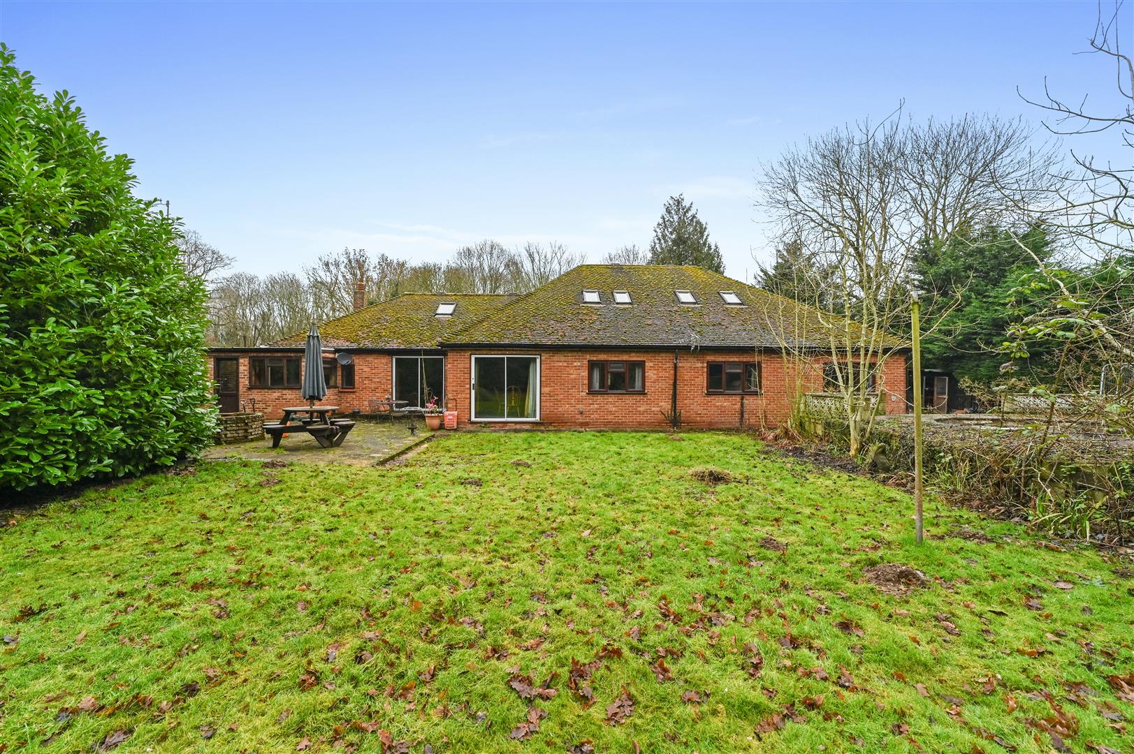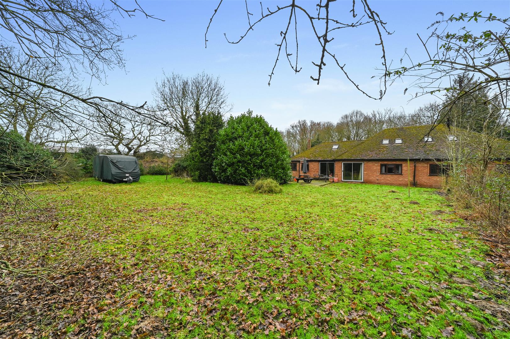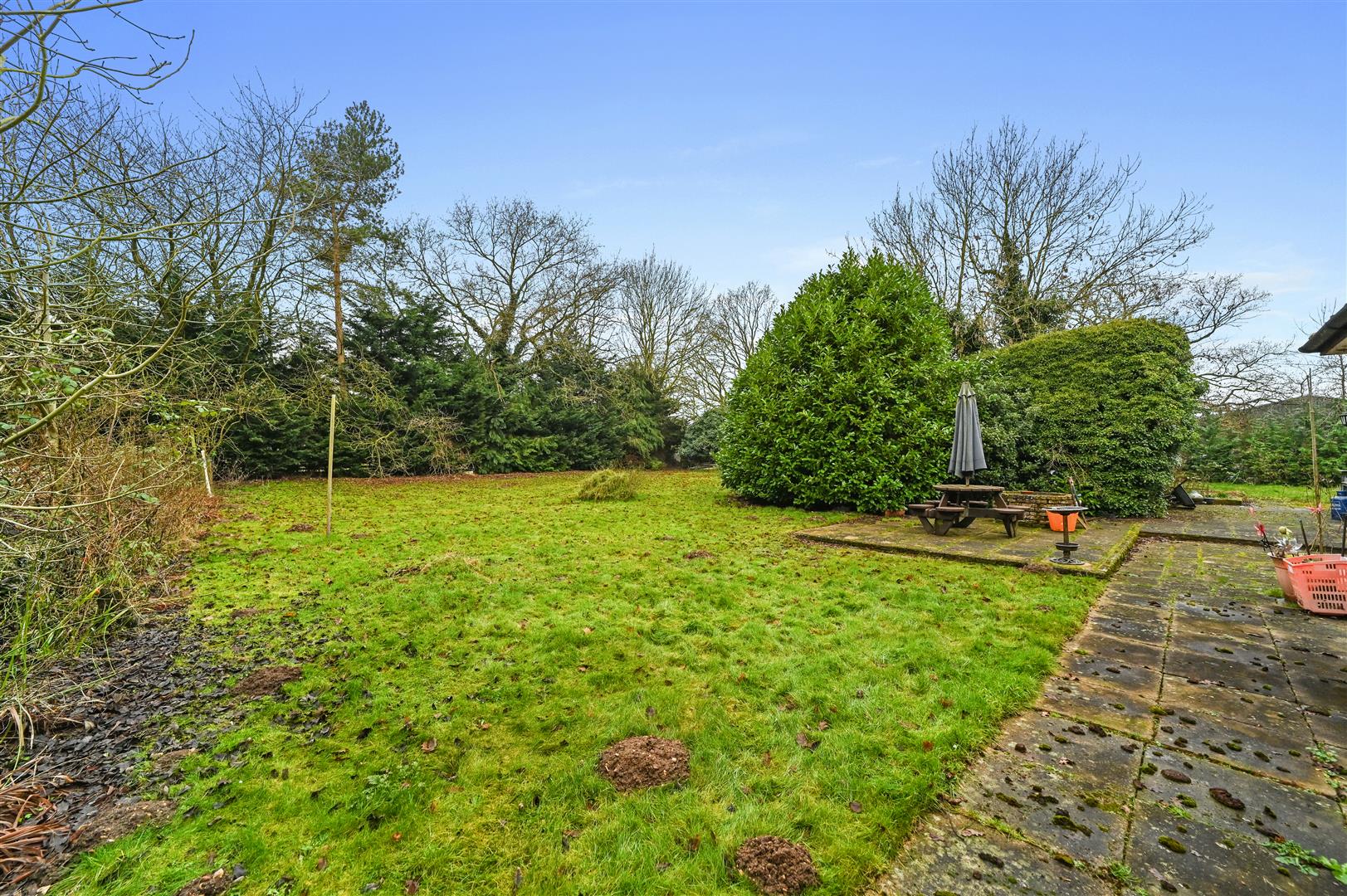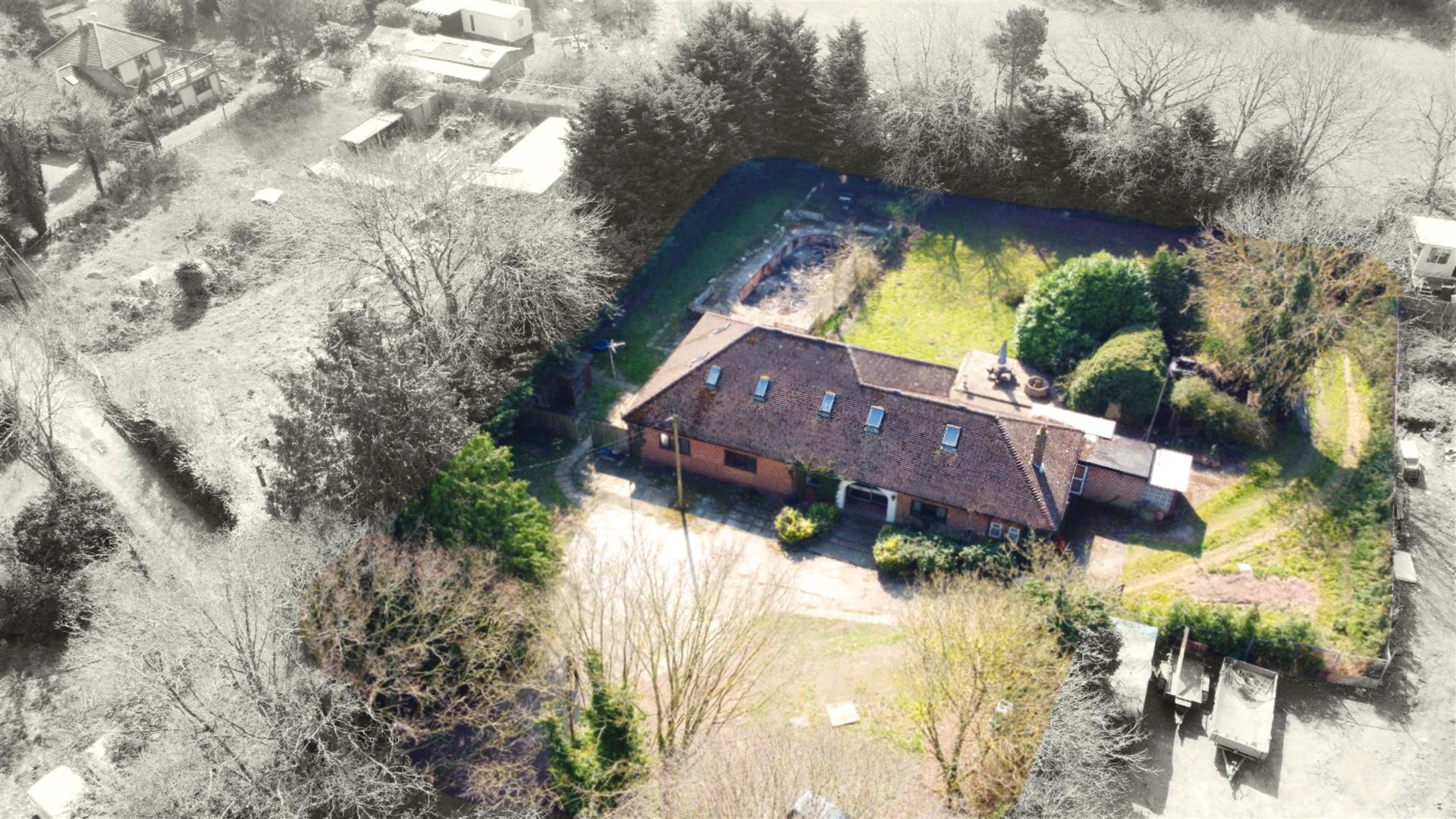 Set on an impressive 0.6-acre plot, the grounds provide a secluded retreat, enhanced by a detached garage, a useful outbuilding, and the remnants of a former swimming pool, all suggesting the potential for leisure and luxury.