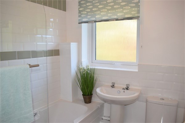 The part galleried first floor landing leads to the 3 bedrooms (2 double, 1 single) and the modern bathroom has an over bath shower. There is loft access via an aluminium ladder to a spacious, partly floored insulated space, with light fitting.