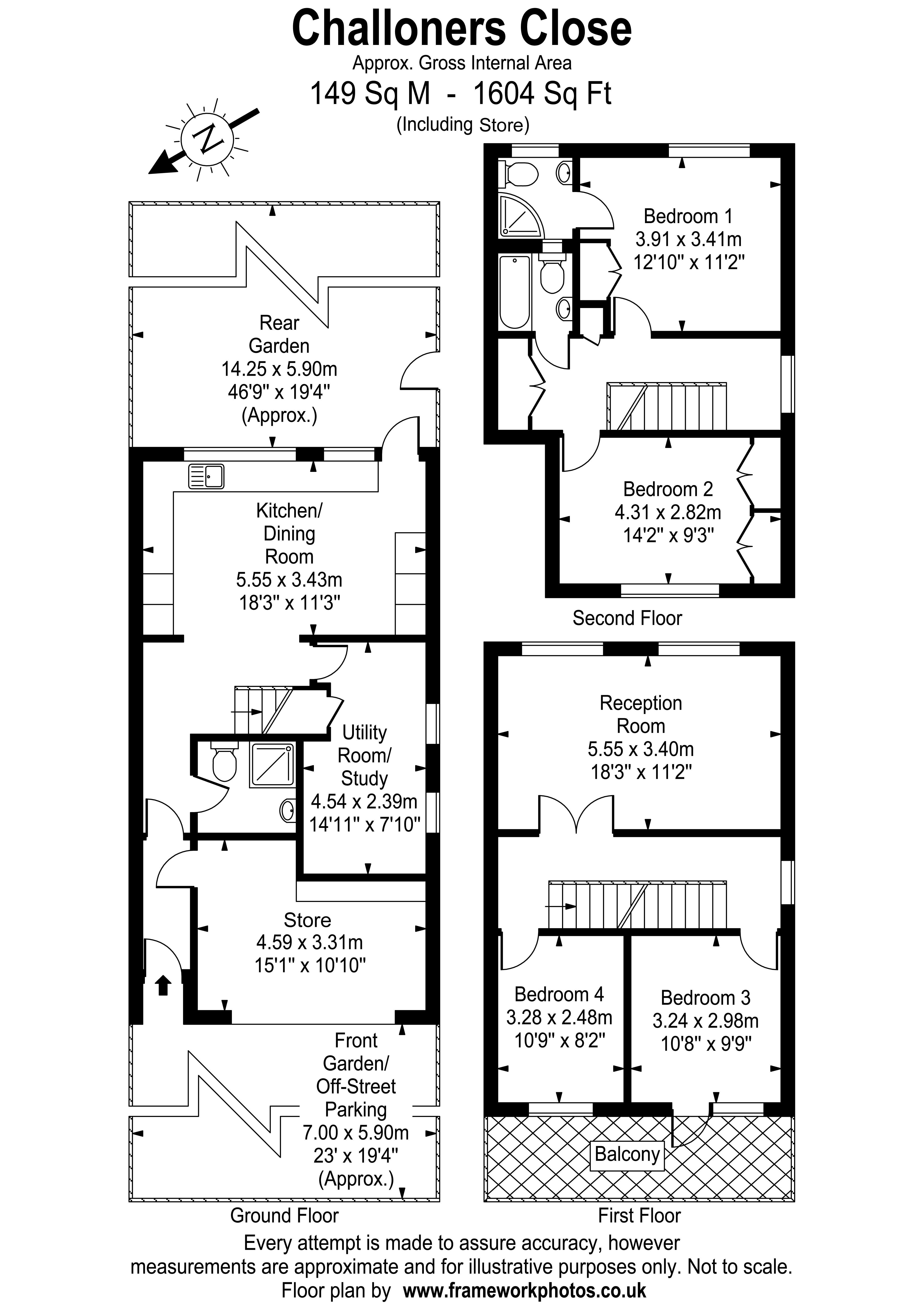 The flexible accommodation is spread across three floors boasting a generous total floor area of 1604 sq. ft. (149 sqm). The ground floor comprises entrance hall which takes you straight through to an inner hallway with staircase, partly open to a good size 'full width' kitchen / diner (of abt. 5.55 x 3.43m / 18' 3" x 11' 3"). The kitchen is modern and well fitted with all the necessary appliances, including space for a large range cooker, plenty of worktop space and excellent storage. This bright room enjoys garden access and is finished with a quality vinyl flooring, down lighters and bespoke radiator. To complete the ground floor accommodation is a good size study, modern fitted shower room and W.C, and internal door access from the hallway to a part garage/store with plumbing for washing machine, and electric up and over door.