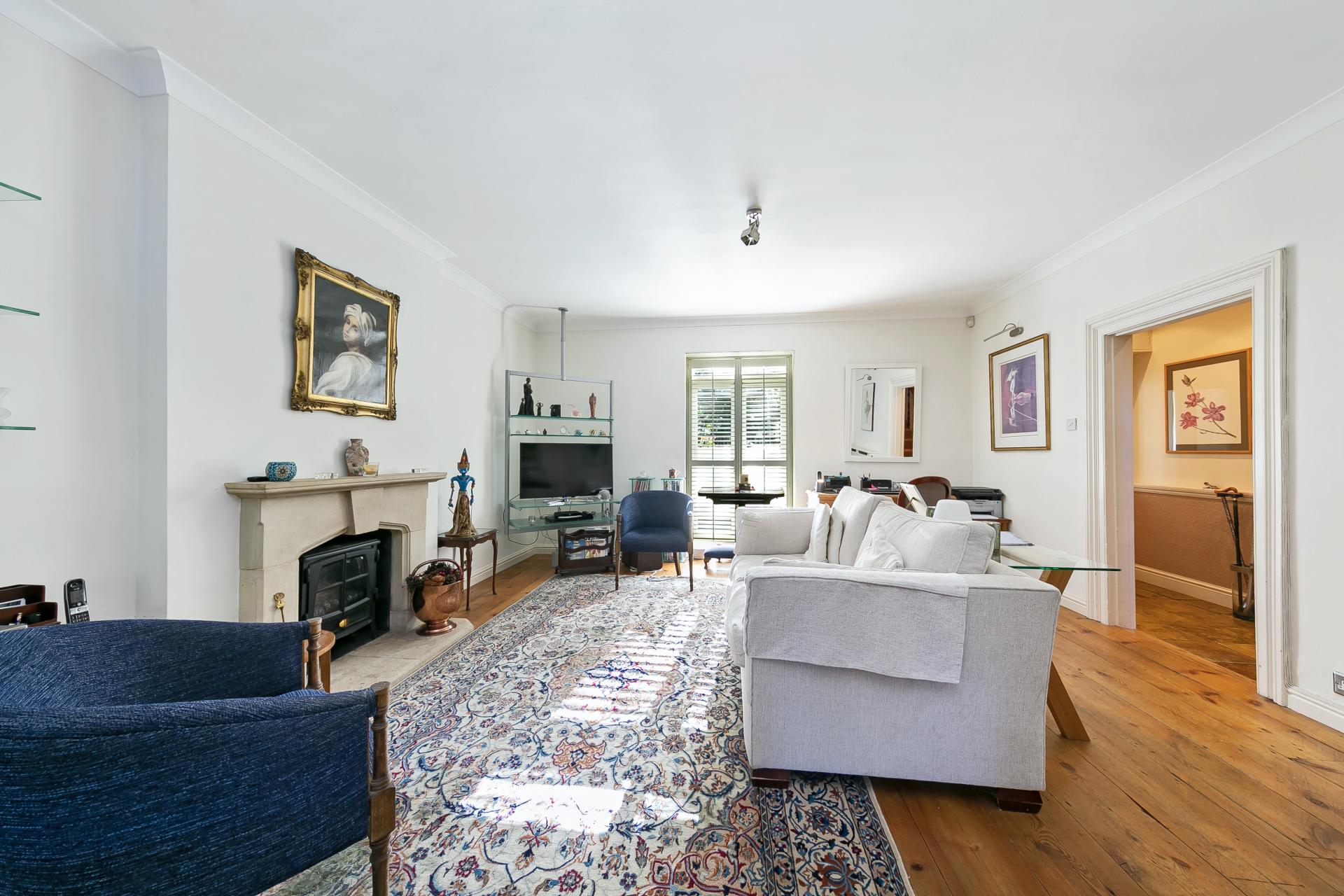 Upstairs, the raised ground floor level provides a landing with high-level storage over the bathroom - perfect for suitcases and Christmas decorations. A lovely front aspect master bedroom - with approx. 3.3 metre high ceiling - is complete with full width built-in wardrobes having storage over, wood parquet flooring, and a large triple sash window (centre opening only) with fitted venetian blind. The second bedroom enjoys double doors with original working shutters, opening to a balcony with an almost semi-rural outlook over established gardens with large mature trees — lots of wildlife and birds can be seen. The bedroom also provides built-in wardrobe and chest of drawers as well as a fitted bookshelf. To complete this floor a beautifully appointed shower room is fully tiled with large walk-in shower, stylish wash basin unit with storage, back-lit mirror, separate medicine cabinet and heated towel radiator.