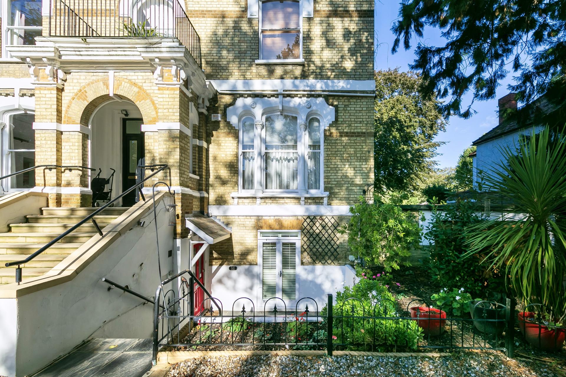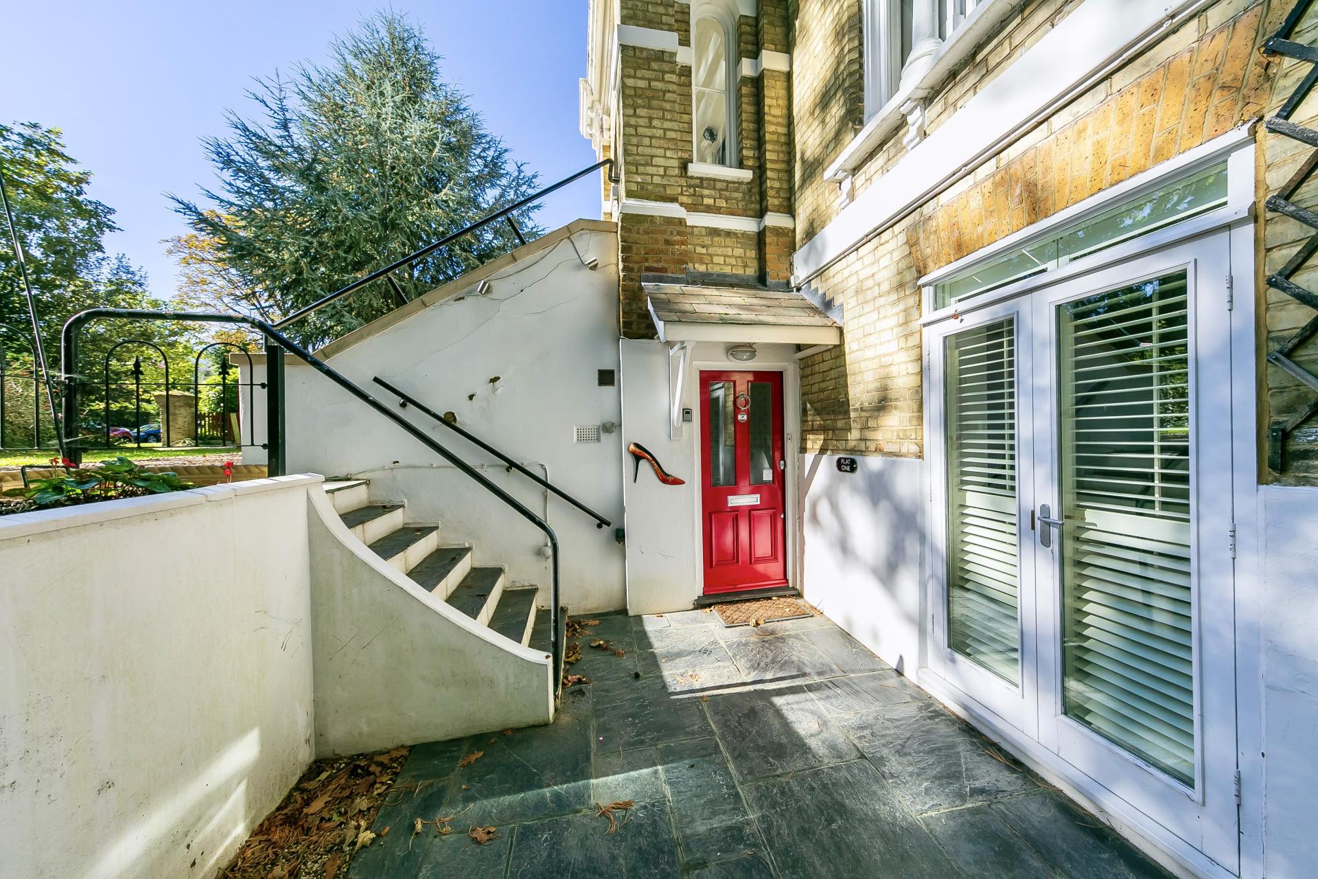 An imposing Victorian building beautifully screened and set back from the road with a carriage driveway. The building consists of only four apartments, each with a share of the freehold and their own private gardens. Steps lead down to a private front courtyard enclosed by railings and a planted border. A private entrance with painted hardwood front door opens to a hallway with access immediately to your left to a separate understairs guest W.C. with wash hand basin.