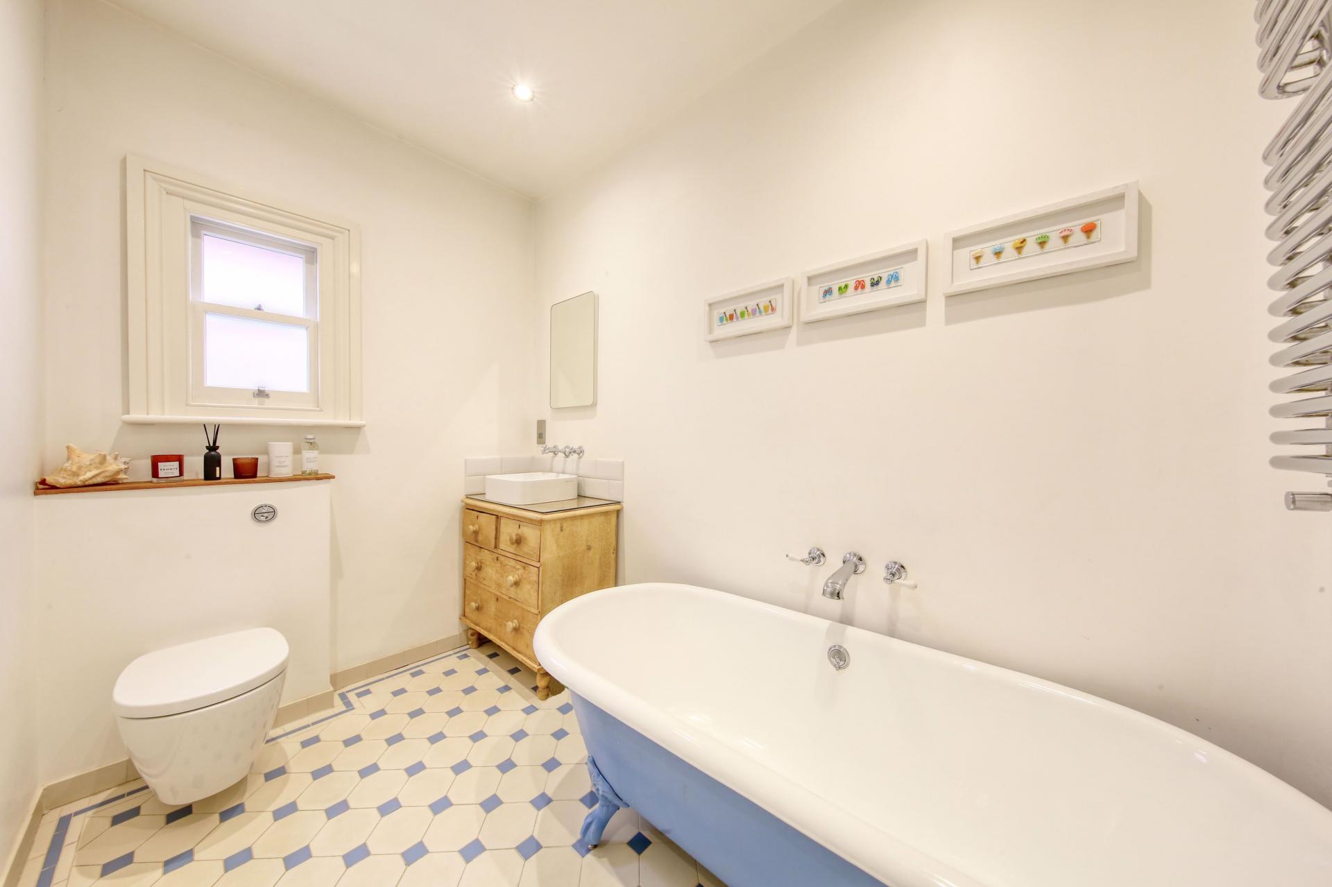 The first floor provides a landing with independent access to all rooms. The front aspect principal bedroom - with fitted wardrobes - enjoys its own ensuite shower room with basin, wall hung W.C and electric underfloor heating. A further double bedroom - again with fitted wardrobe - and an adjoining good single (both rear aspect) are supported by a particularly spacious main family bathroom complete with oversized 'walk-in' shower, cast iron roll top bath, wall hung toilet, worktop basin and Victorian tiled floor with electric underfloor heating.