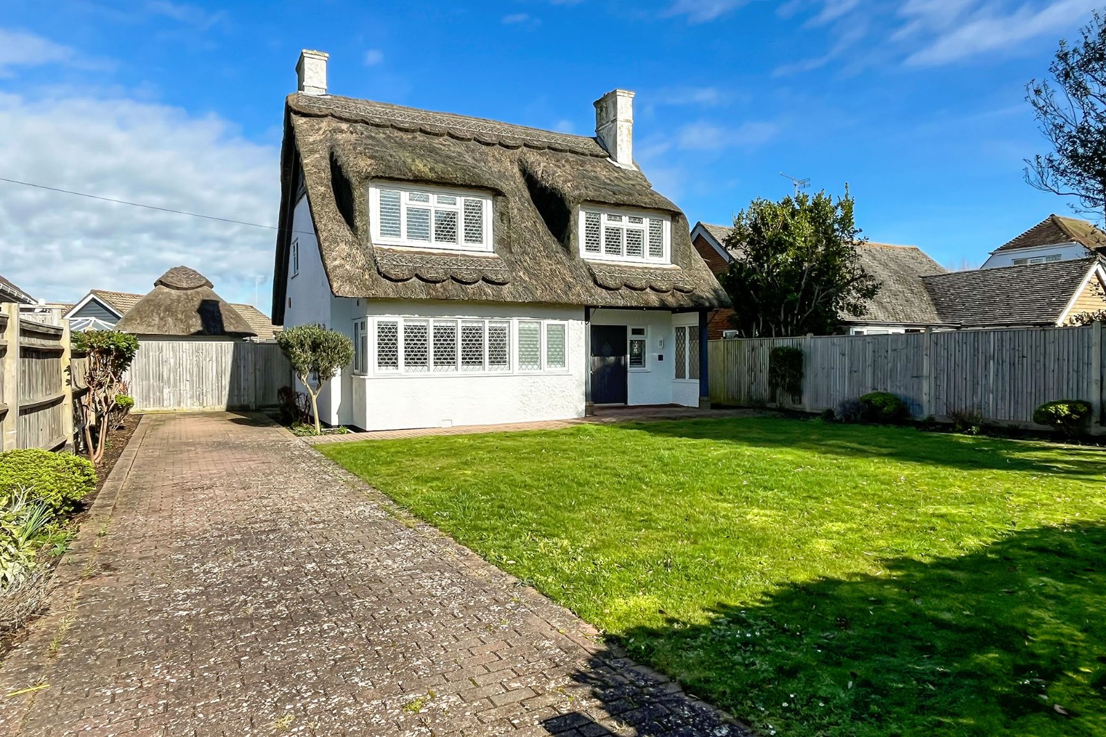 This incredible opportunity to purchase this ONE-OFF thatch detached family home situated in a popular yet peaceful road on this private estate just moments from local amenities and seafront. From the moment you enter the large, gated driveway you can immediately see the impressive accommodation that's on offer. Once inside the ground floor comprises, large entrance hall with feature brick fireplace, ground floor cloakroom, multiple versatile reception rooms/bedroom with ground floor shower room/wc, stunning kitchen with open conservatory that leads straight out to the beautiful rear garden. Upstairs you will find two double bedrooms both with en-suites. Outside, the rear garden offers the perfect balance of usable lawn and patio making it ideal for entertaining and keen gardeners alike. To the front you have a gated entrance opening to a large driveway for ample cars leading to the detached thatch garage currently being used as a utility room with sink and wall mounted boiler. This imposing family residence is a true gem and early viewings are highly advised.